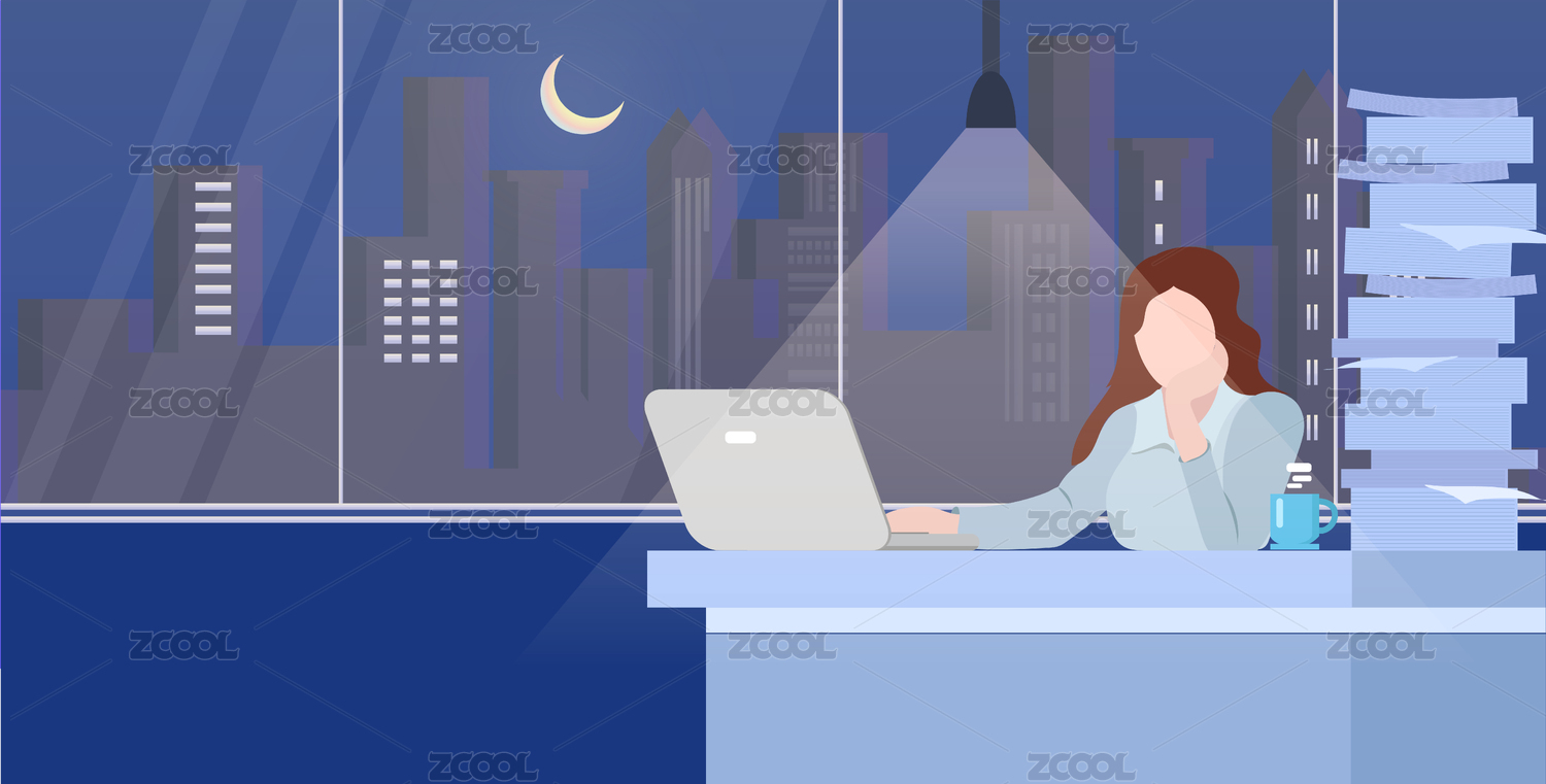 深夜在办公桌前辛苦加班工作的女性——插画