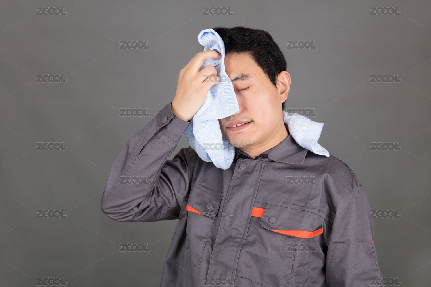 辛苦的工人用毛巾擦汗