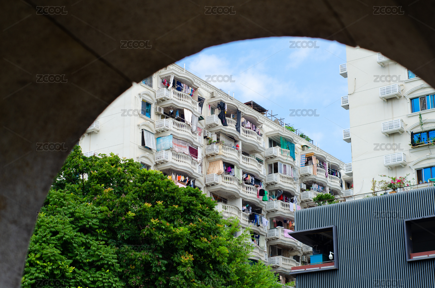 福州上下杭透过拱门看居民楼生活景象