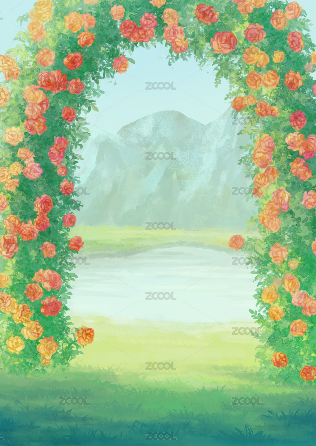 户外玫瑰花卉蔷薇月季拱门蓝天山水湖泊风景
