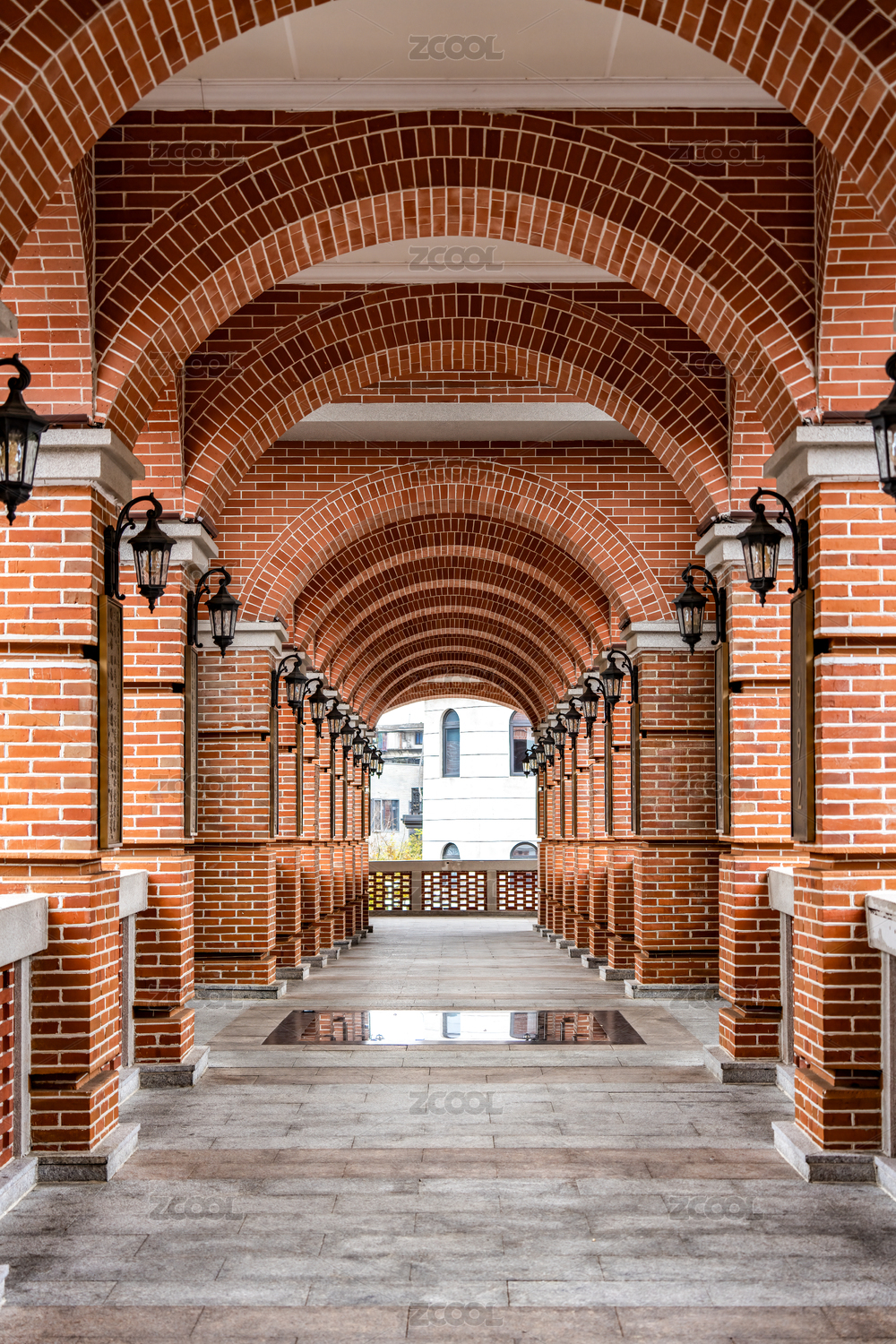 红砖拱门柱廊石径