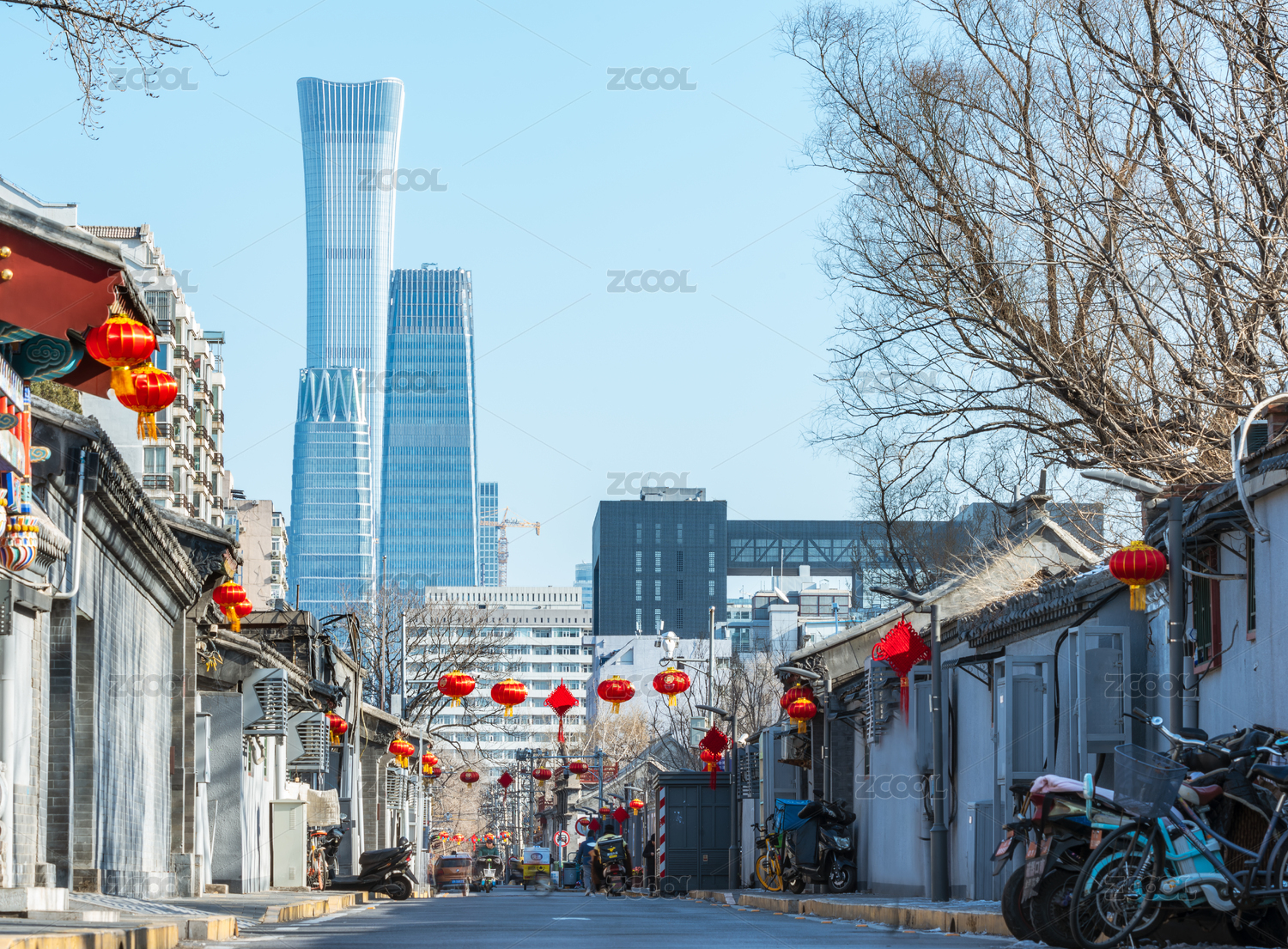 中国北京东城区西总布胡同和CBD现代建筑夜景
