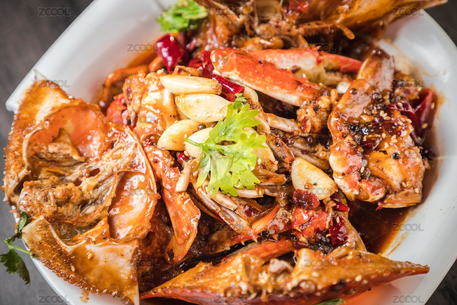 白底上放着一盘香辣蟹