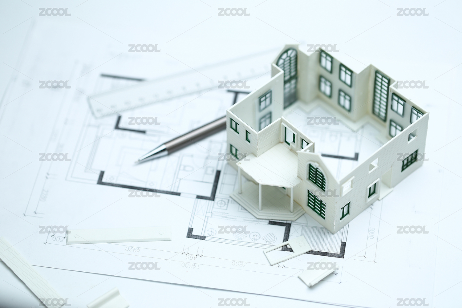 俯视拍摄满桌子的建筑图纸和工作中的设计师