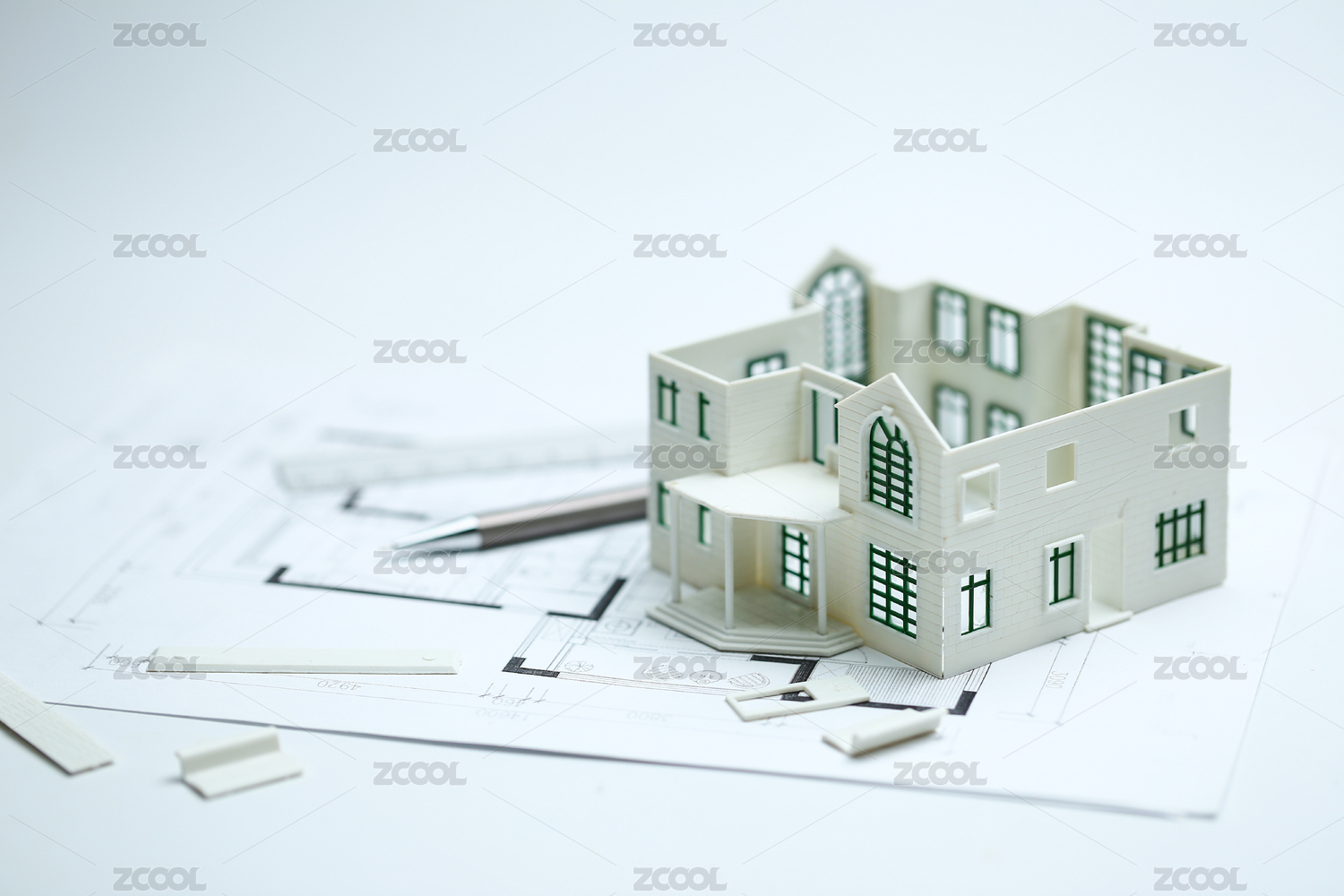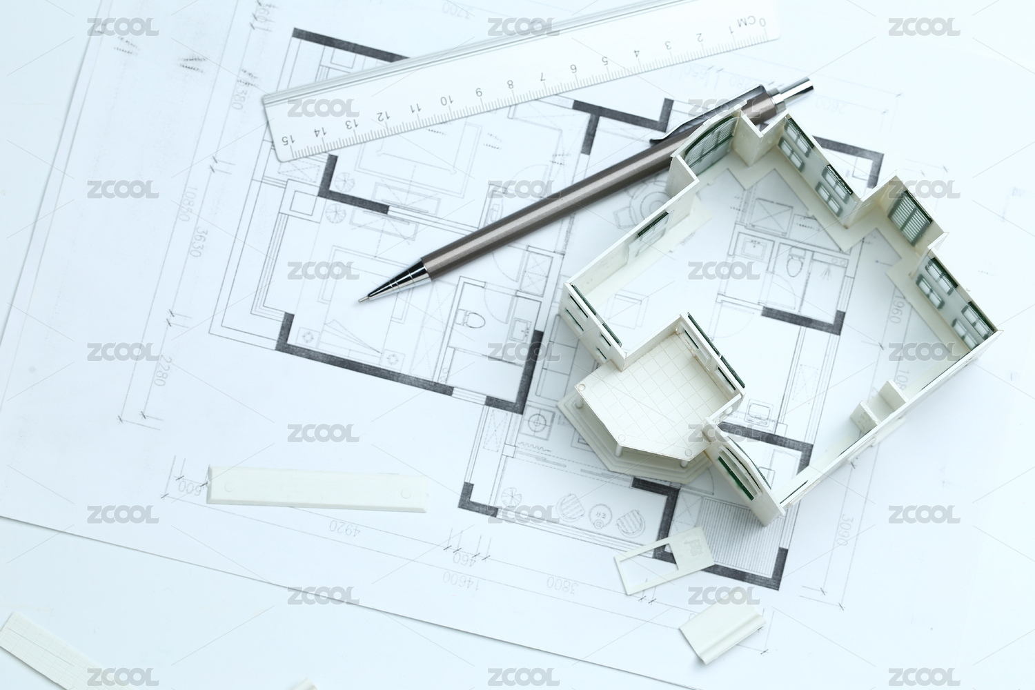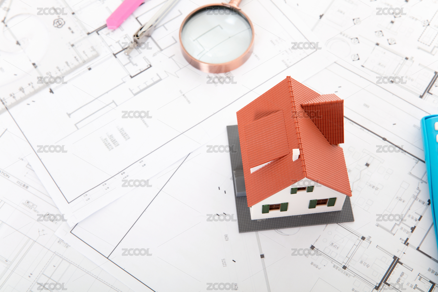 一只手指着建筑图纸上的细节及旁边一些相关修改工具