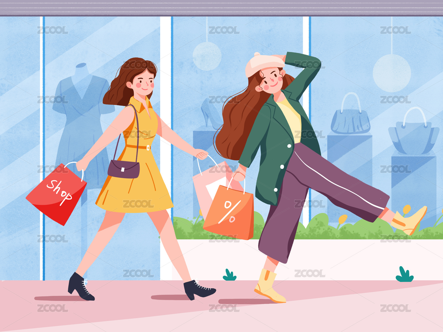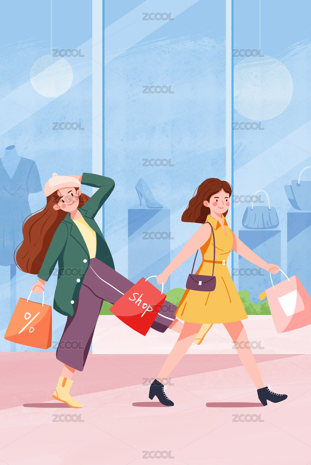 卡通扁平风两个女孩闺蜜电商节一起开心购物