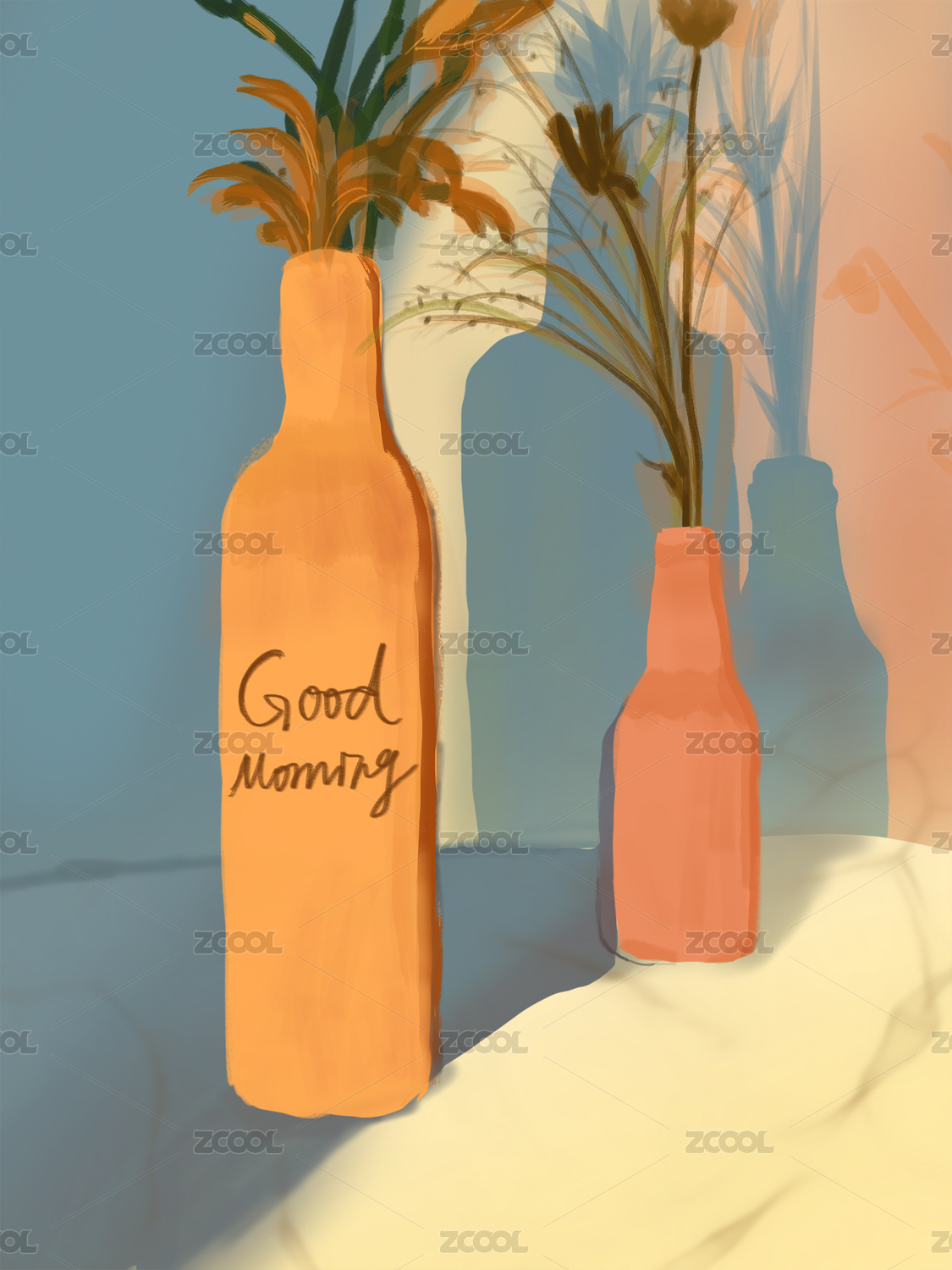 室内静物桌面花瓶装饰插画扁平风肌理竖幅