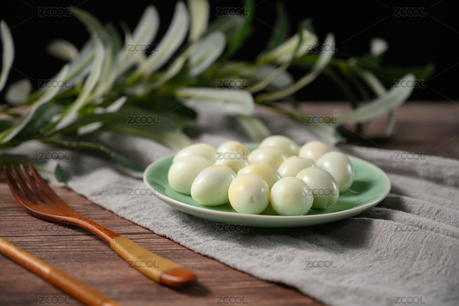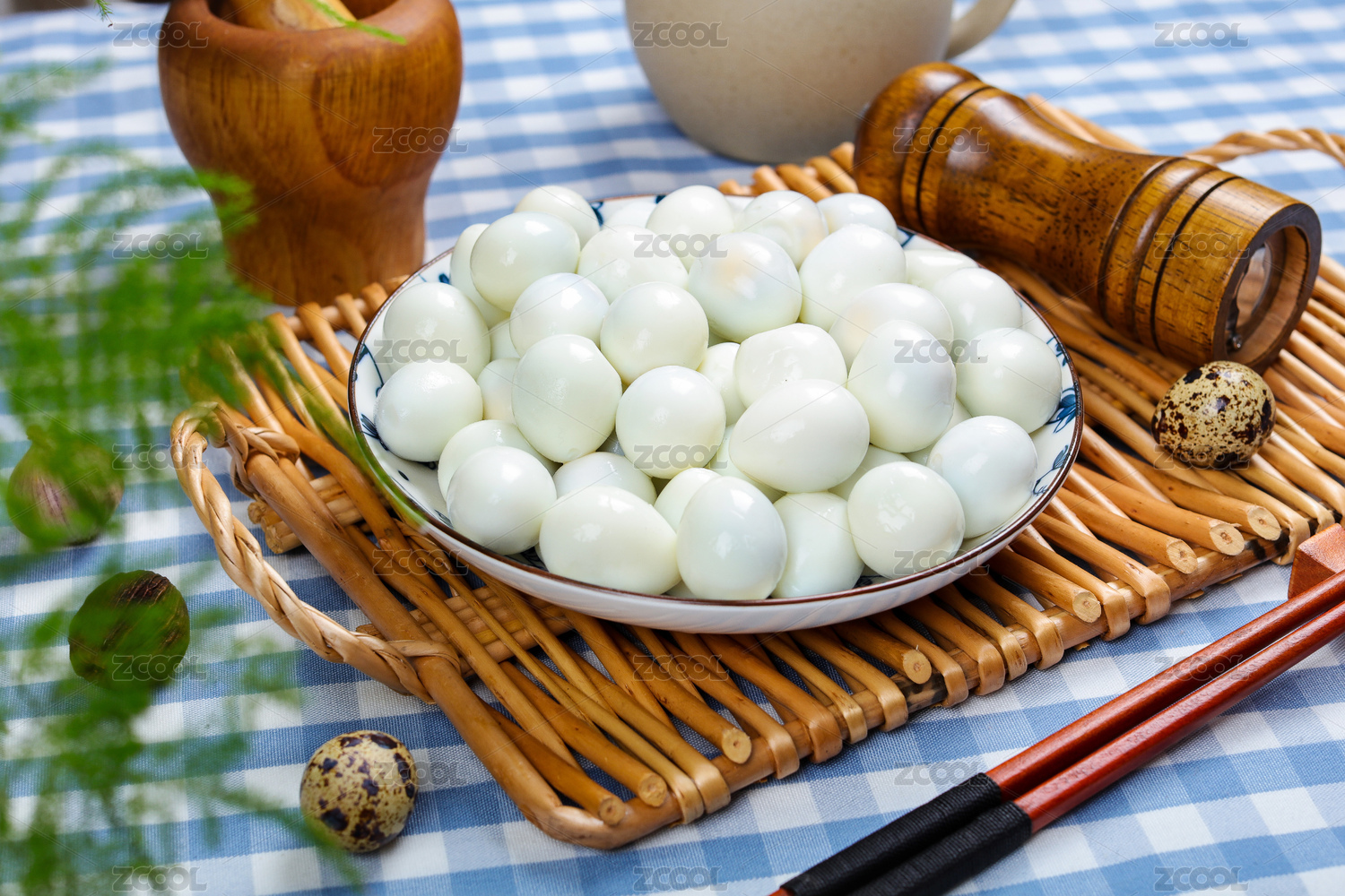 桌面上的盘子里的美味可口的水煮鹌鹑蛋