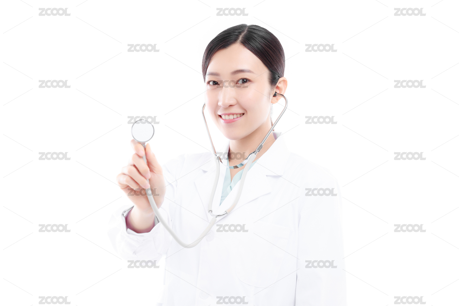 身穿粉色护士服佩戴听诊器的女性医护人员