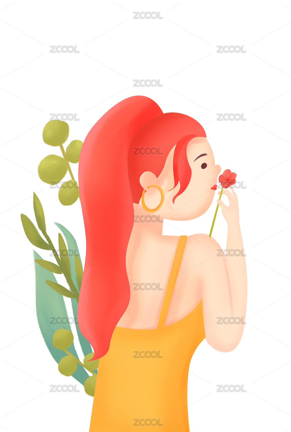 手拿花束仰头闻花香的女生插画竖图