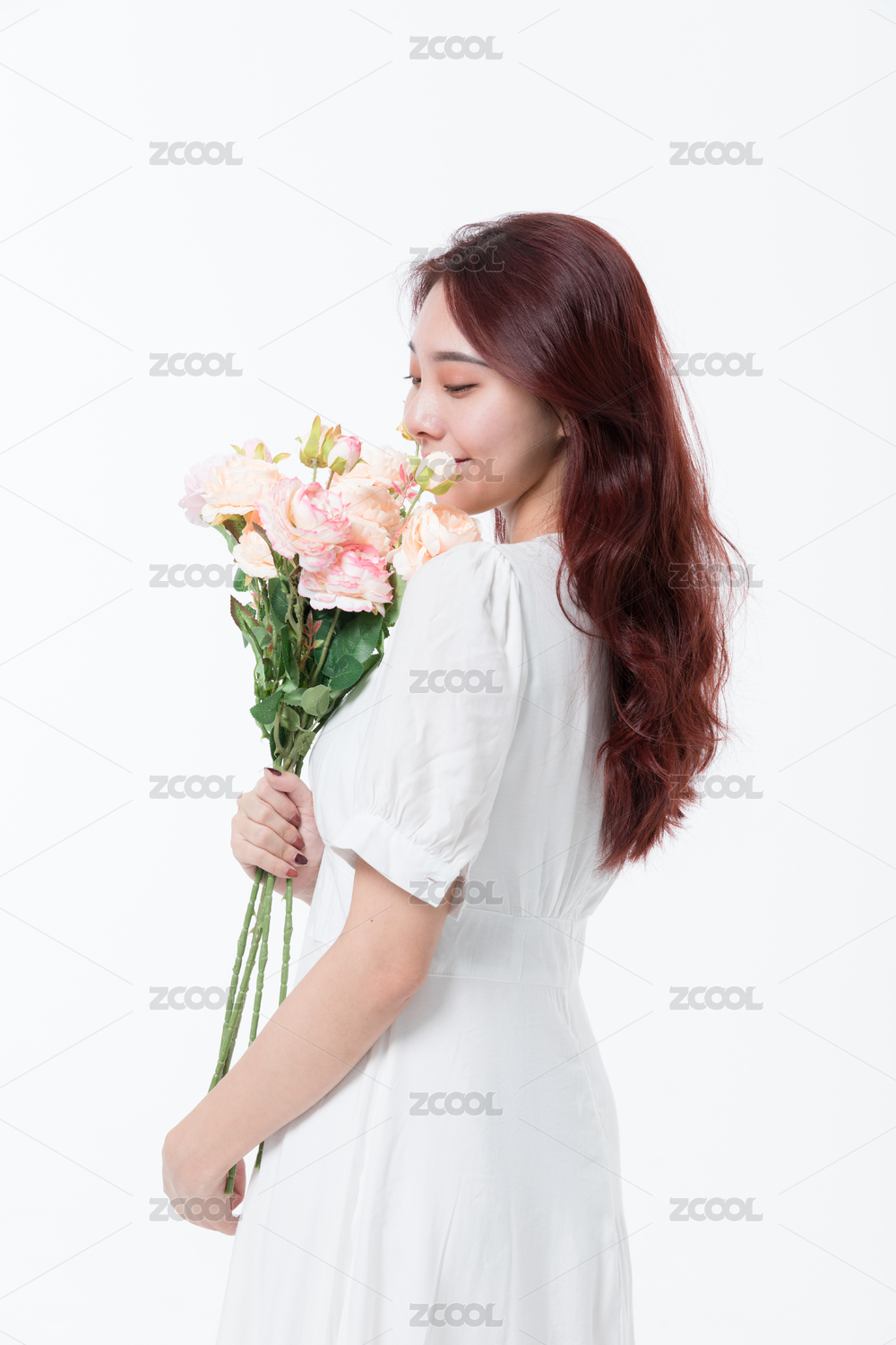 七夕古装美女手拿着一束玫瑰花在闻花香