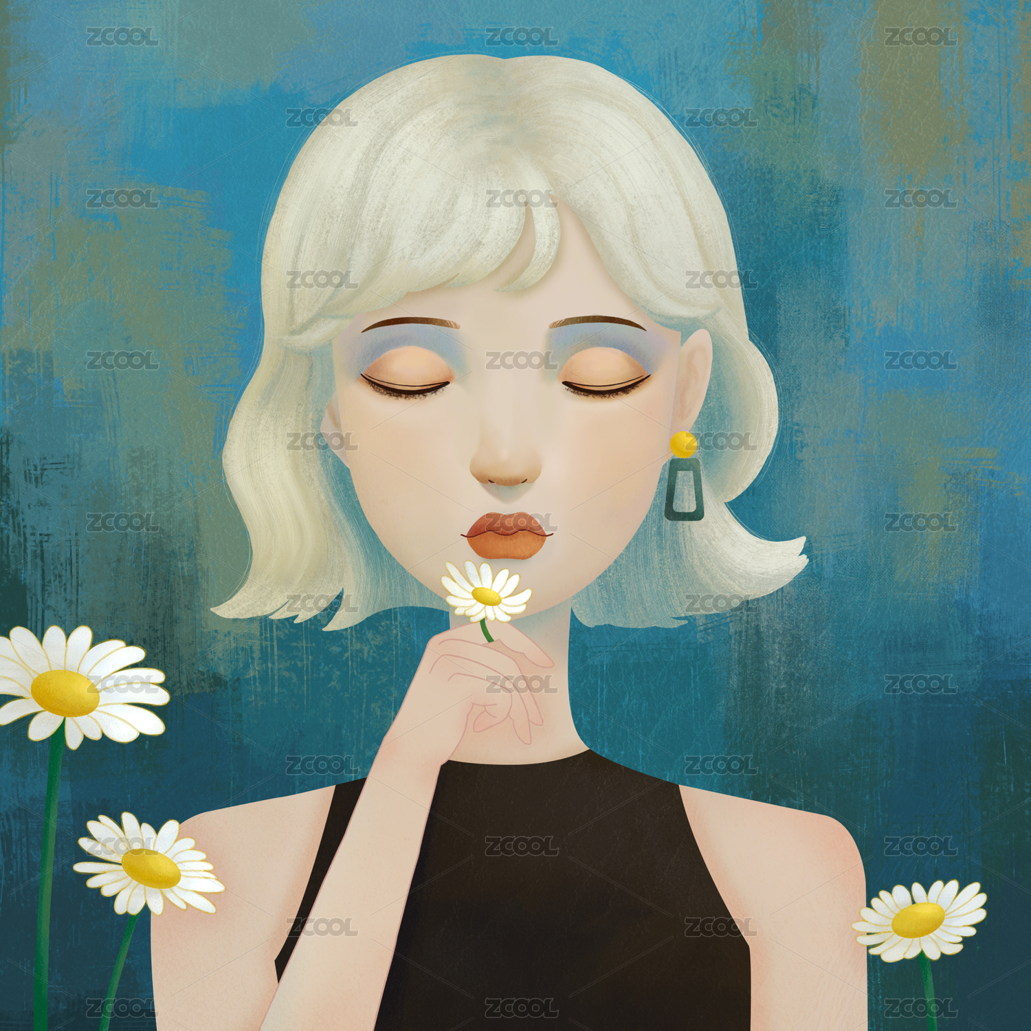 女孩花朵文艺清新春天扁平肌理插画