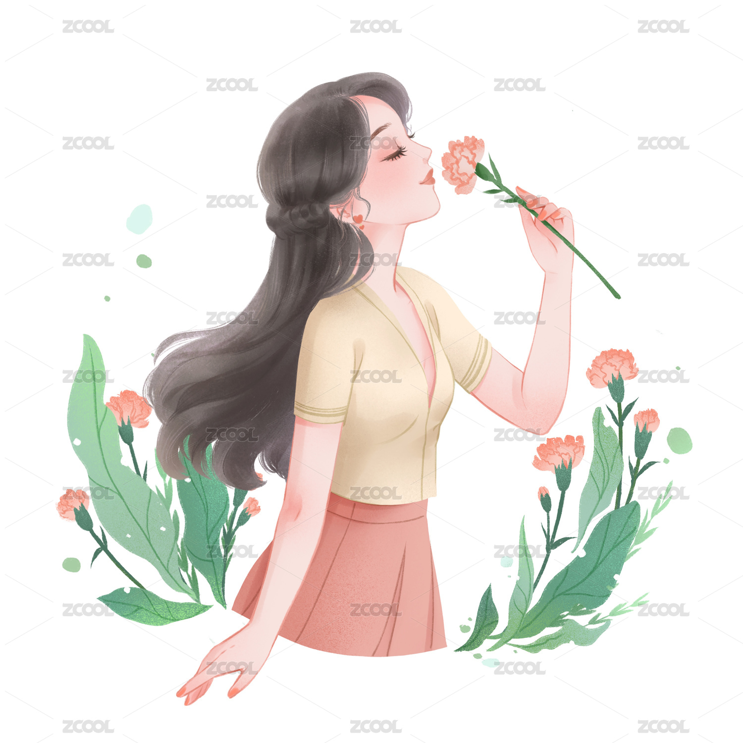 站在鲜花面前手拿捧花欣赏的女生插画竖图