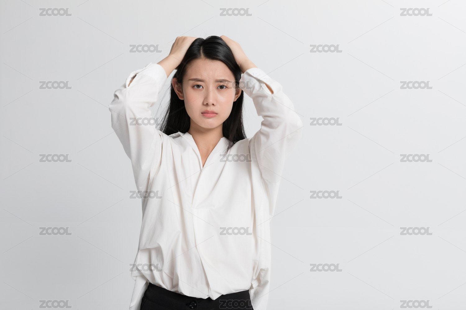 白色背景下一个中国女员工穿着正装西服抱着自己的头感到很烦恼头痛头疼压力大