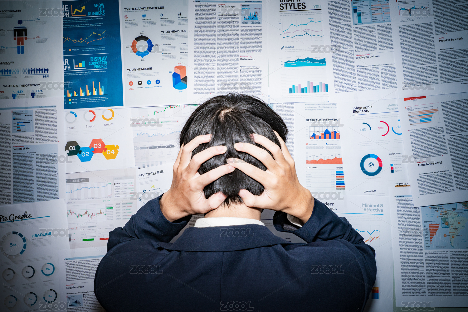 金融人士男人看着满墙报表图表超负荷加班工作却不明白思考不清楚压力大头痛概念