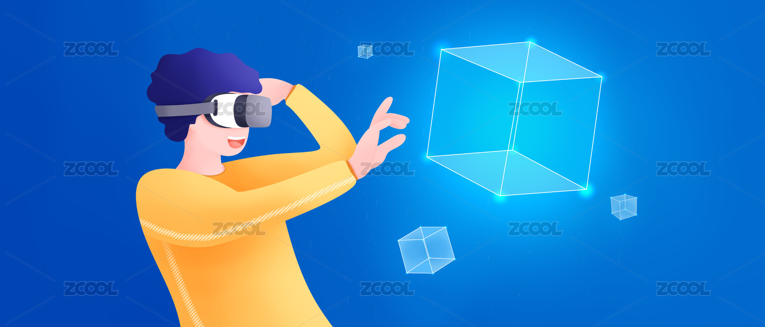 戴着VR眼镜的青年在虚拟几何空间漫游插画
