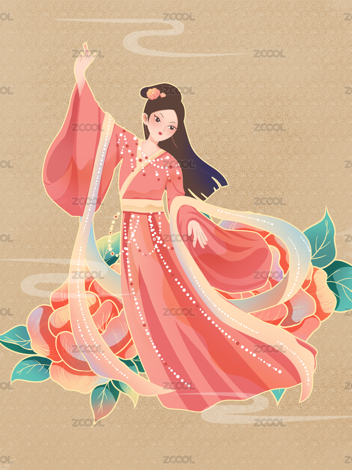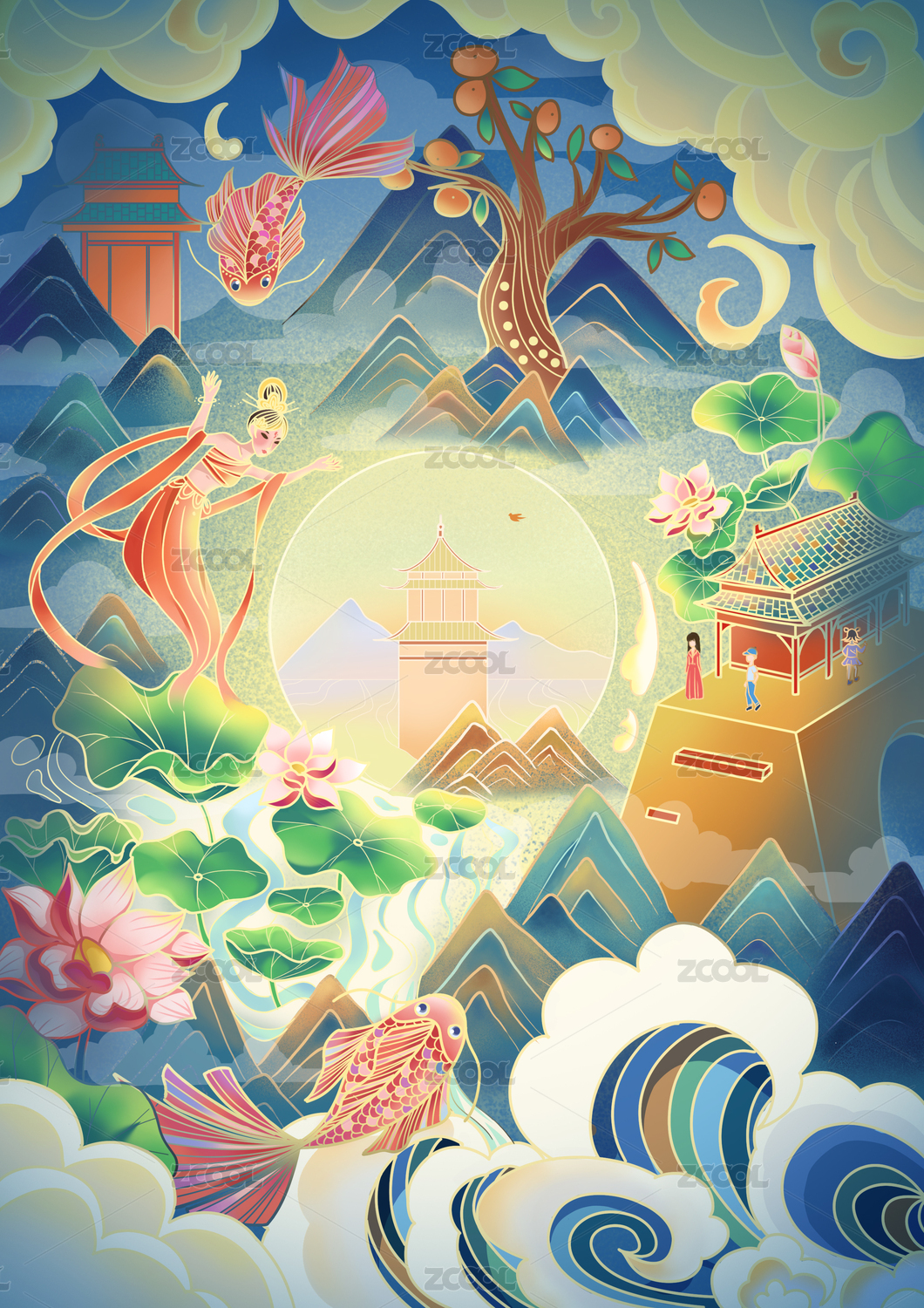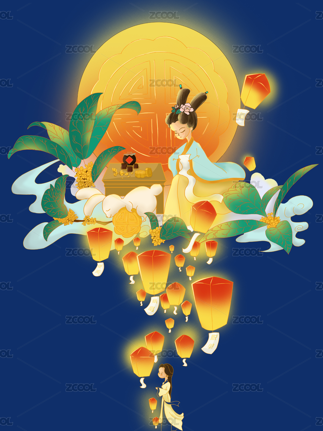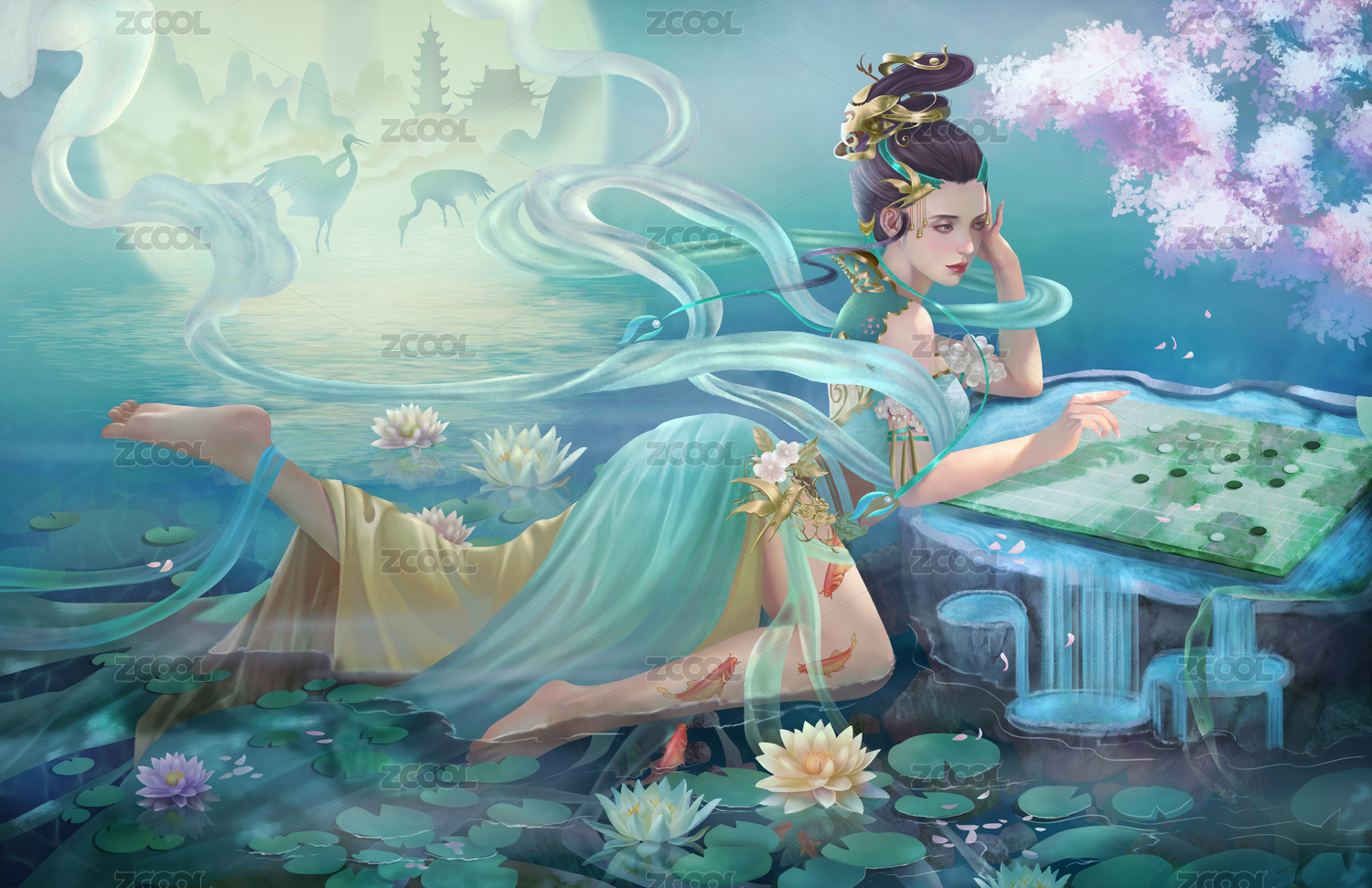 中秋夜衣袂飘飘的嫦娥仙子在莲花池下棋