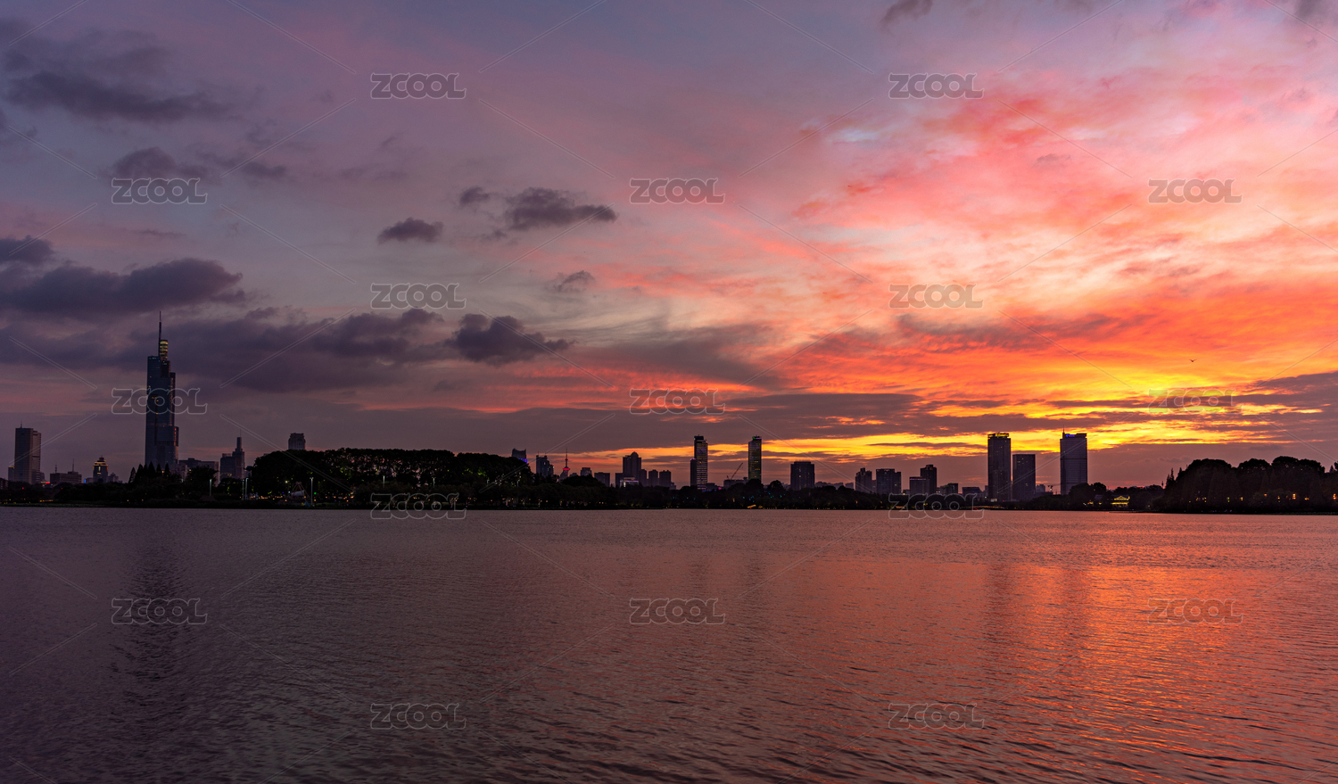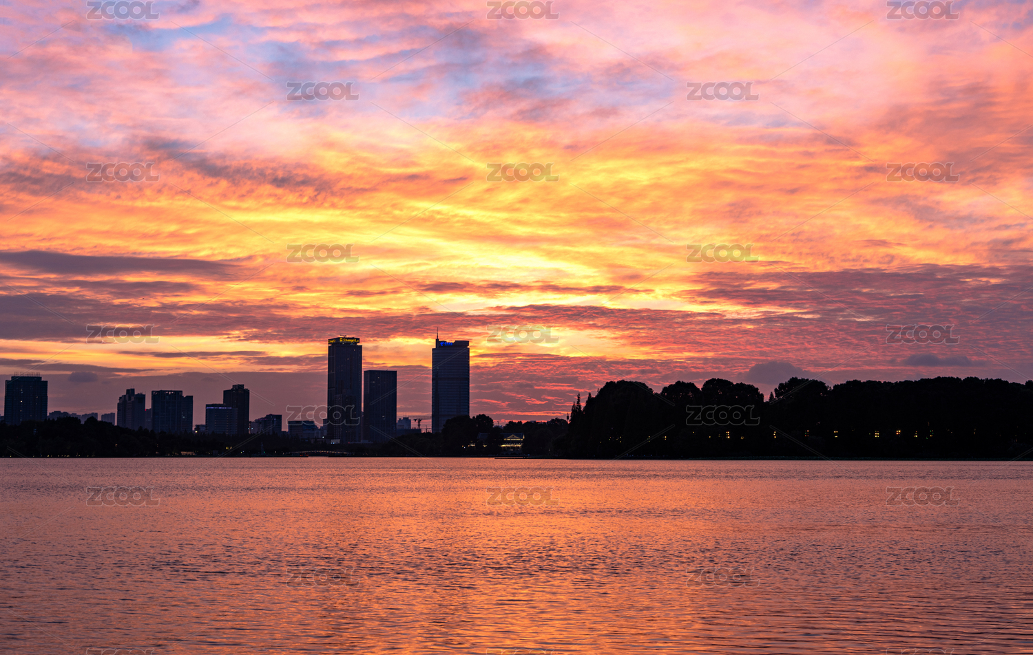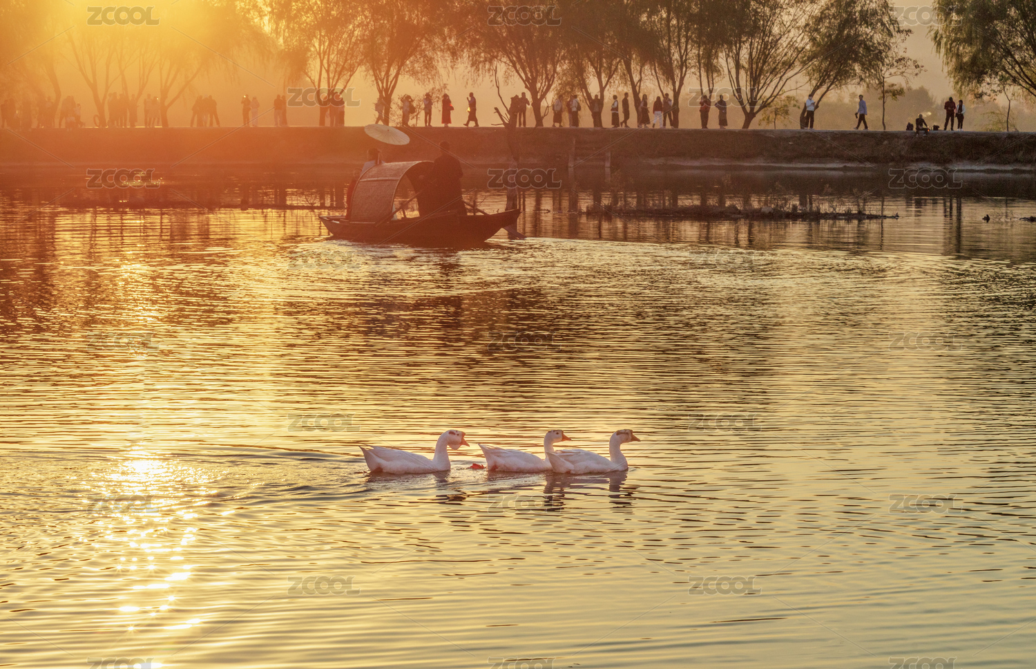 中国湖北黄冈,夕阳落日时的湖边景观