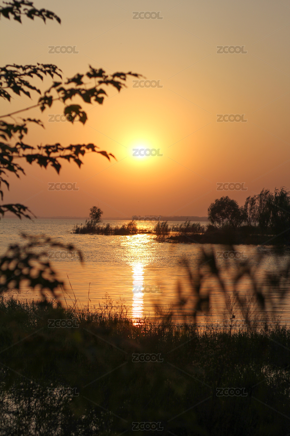树枝为前景的湖边金色落日