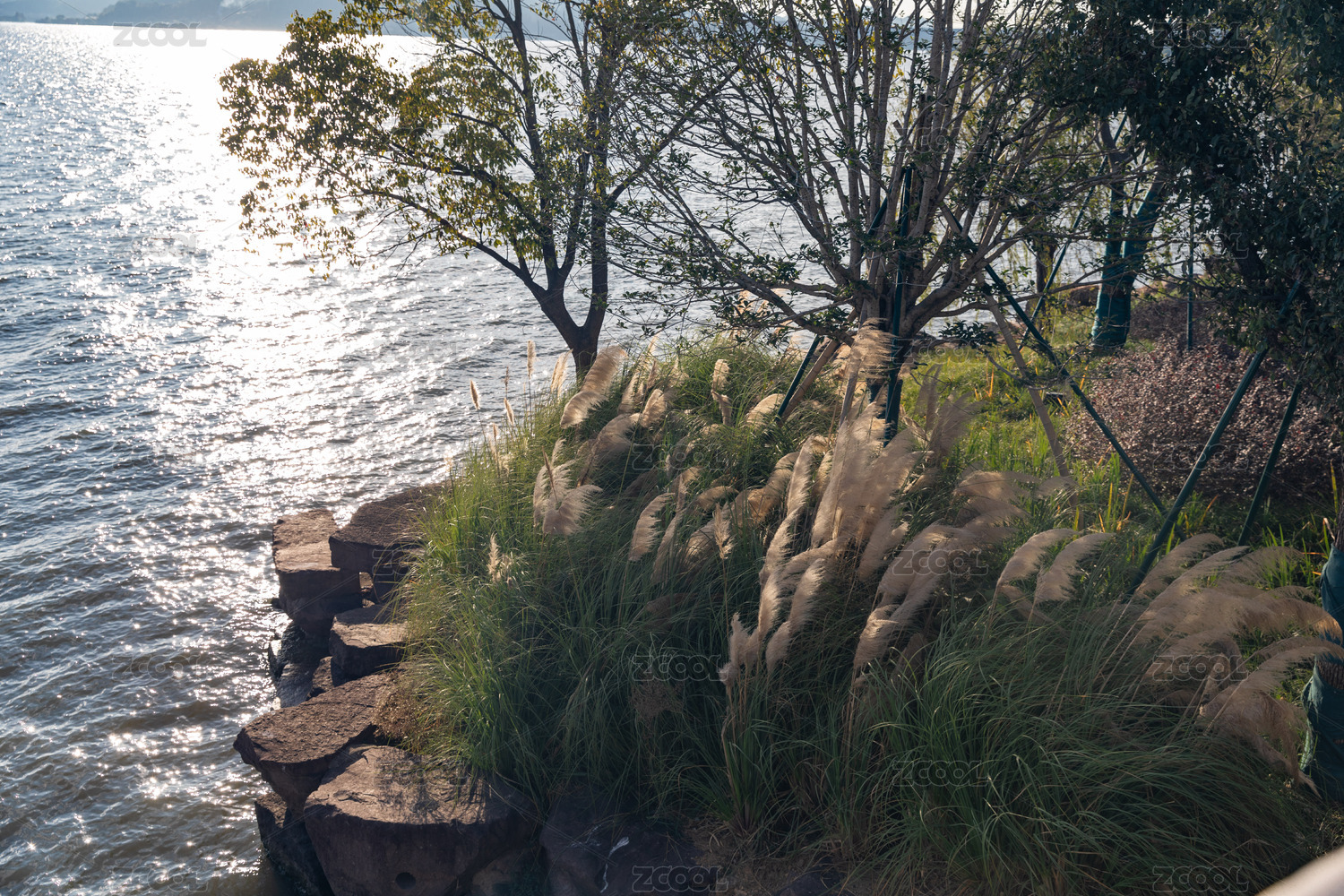 岸边的芦苇荡湖水波光粼粼