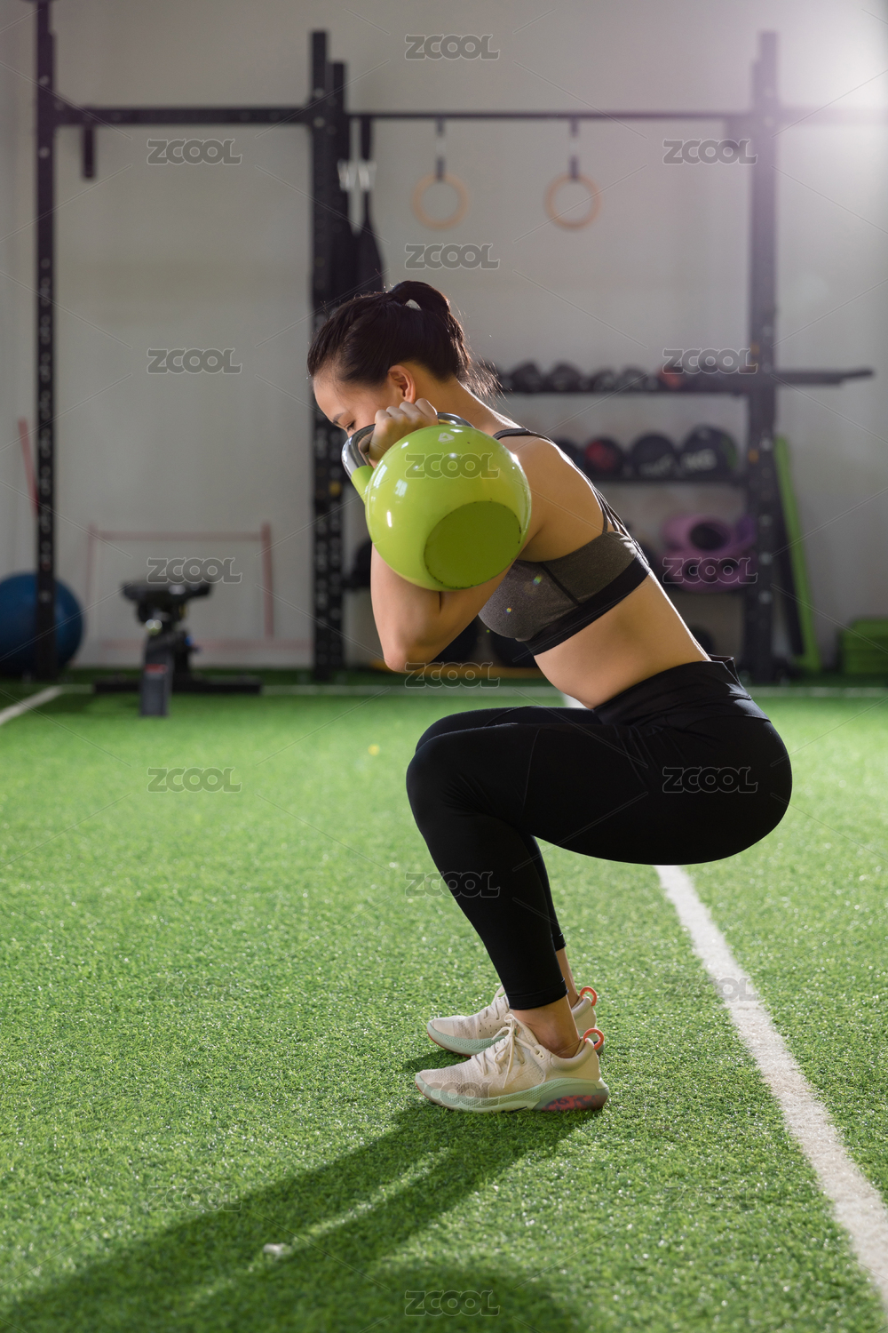 健身房里做壶铃深蹲的教练