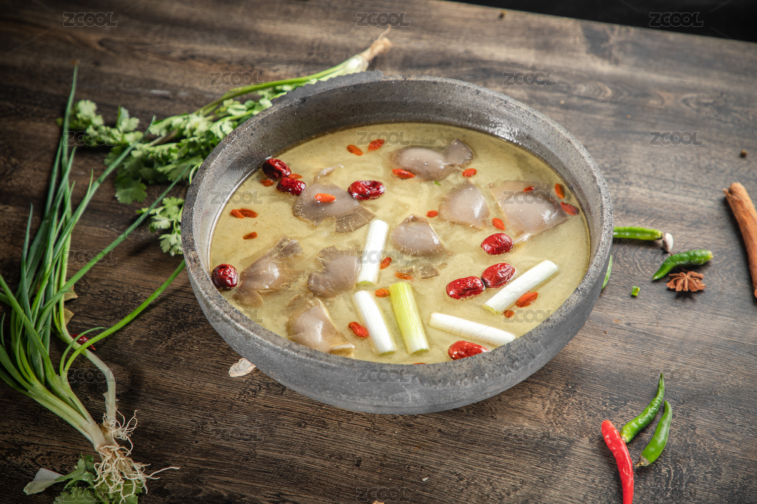 棕色木纹桌上放着一盘高汤平菇砂锅