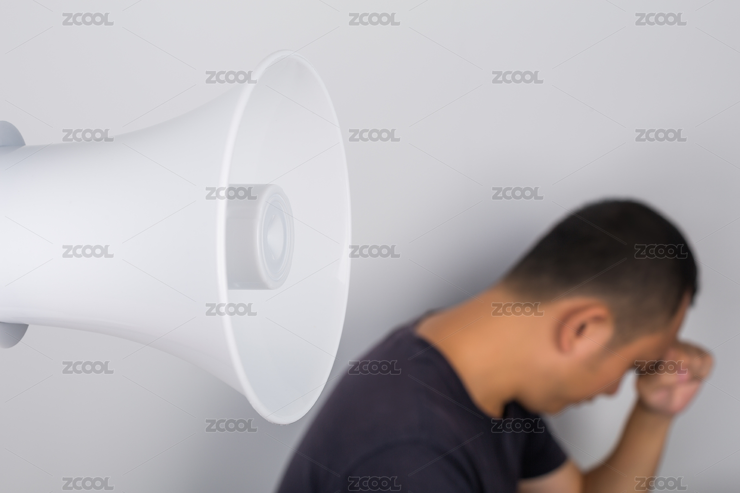 喇叭对着一个捂住耳朵的男人