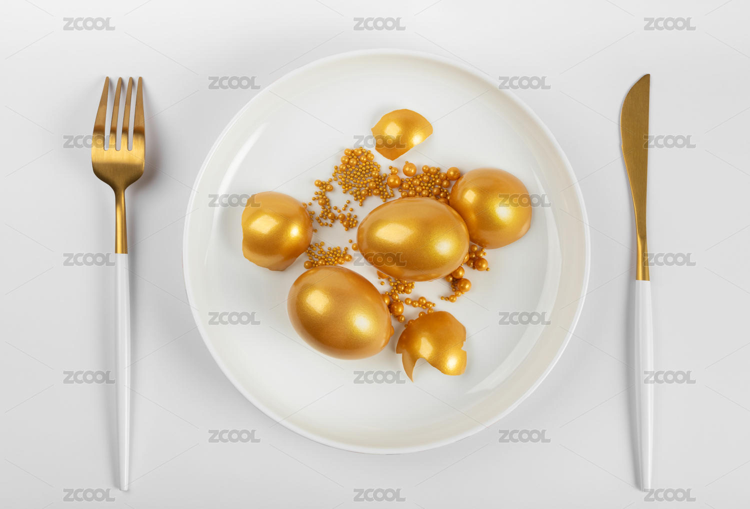 叉子餐具盘子里的金蛋金珠子