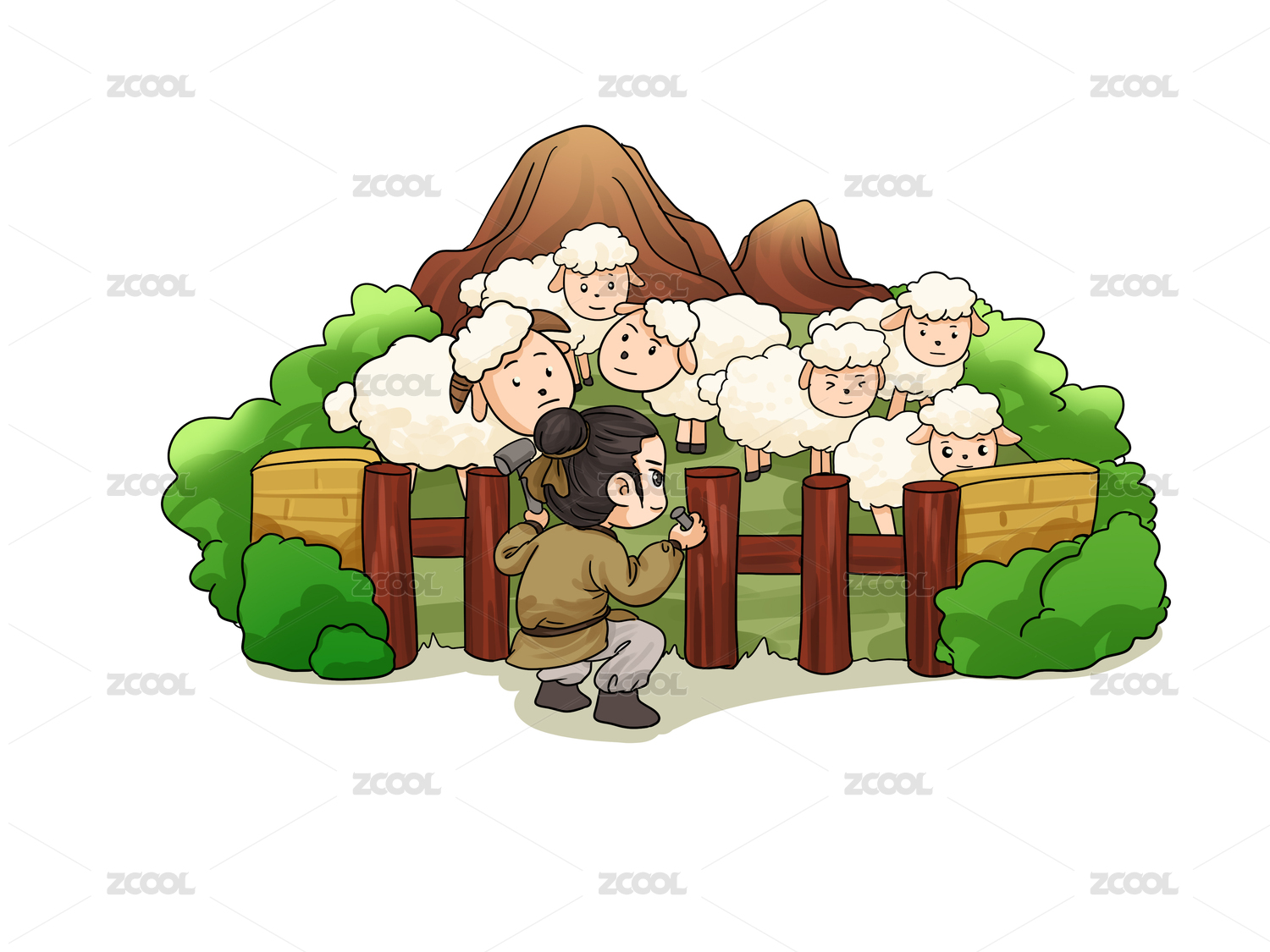 成语故事亡羊补牢蓝色古装男士和绵羊羊圈