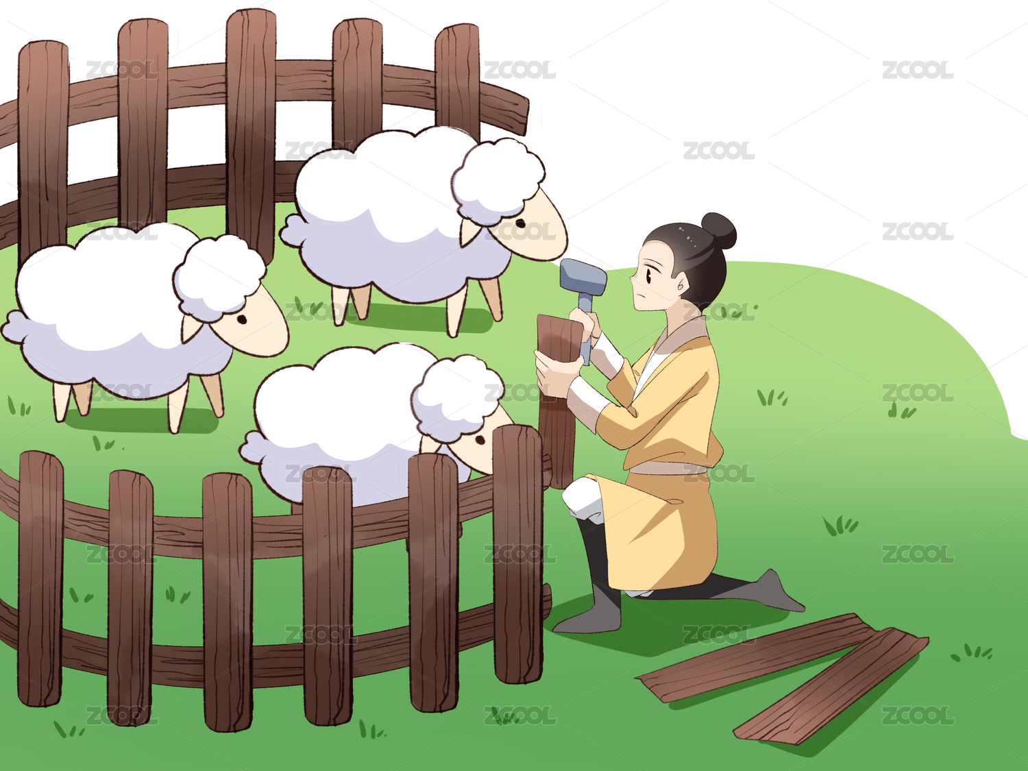 成语故事亡羊补牢黄色古装男士修理羊圈门