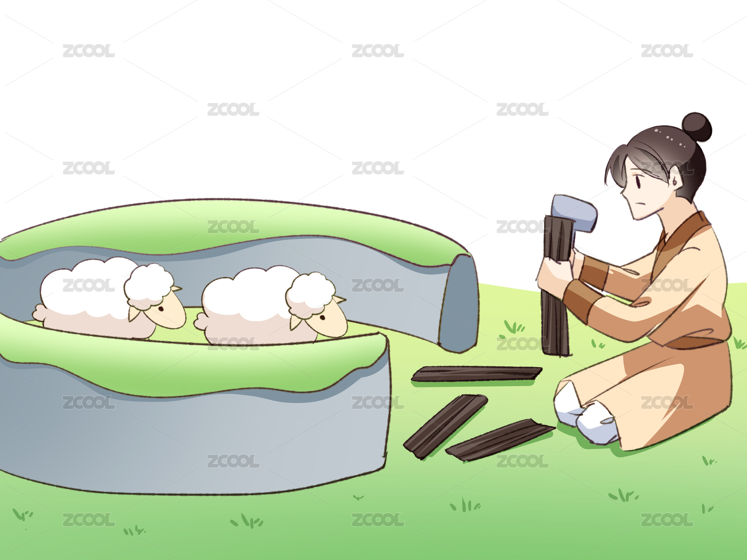 成语故事亡羊补牢黄色古装男士修补羊圈小