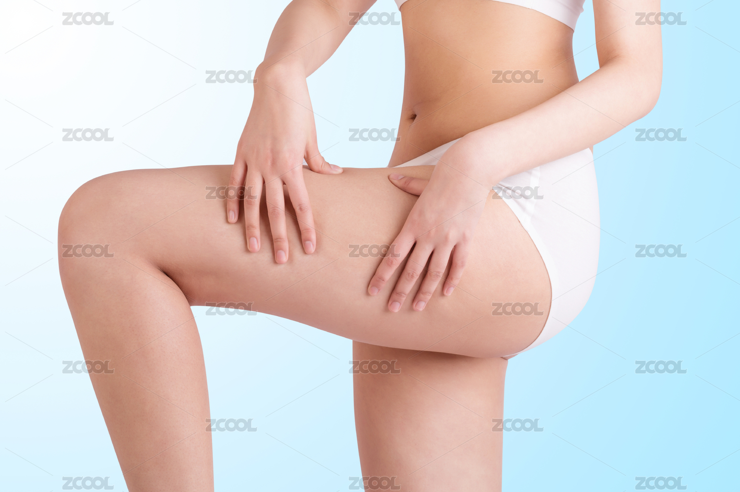 年轻美丽的女性抬起大腿并用手标识大腿部位