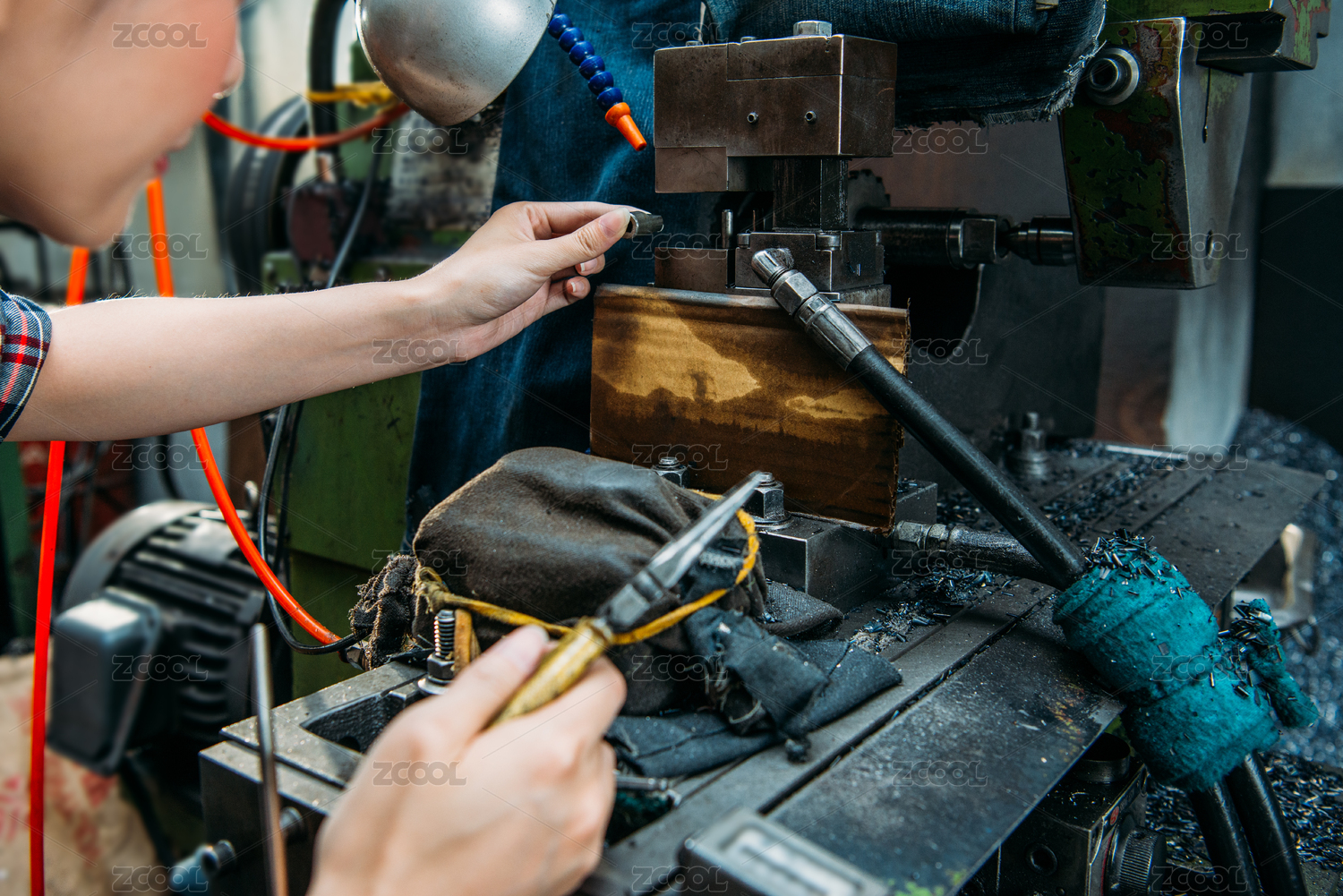在铣床专业配件厂女员工发生部位与选择性的重点照片拿着钳子。