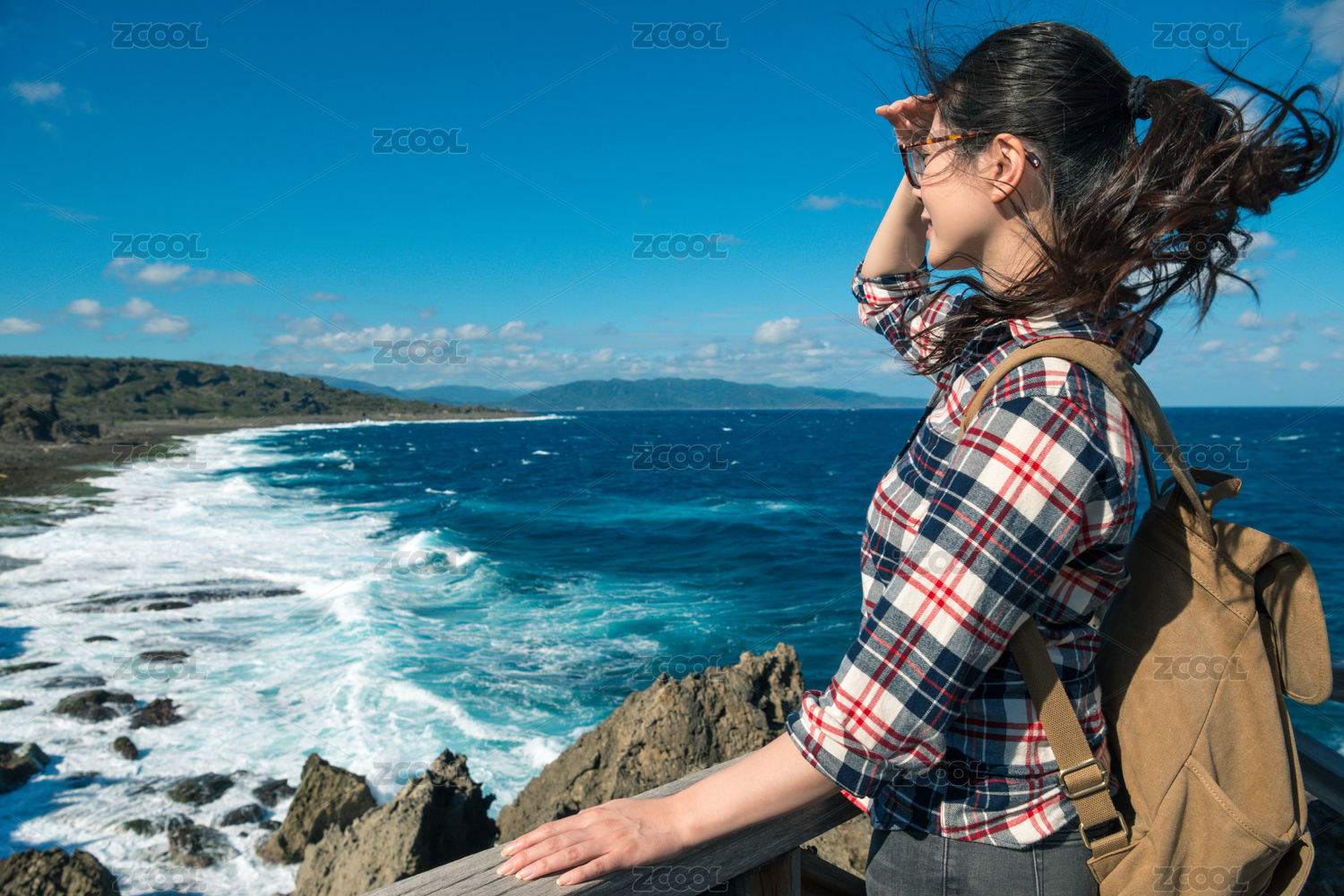 幸福的微笑的女人在背包客的热带岛屿登山,看着与舒适的海风顶部位置美丽的波图。