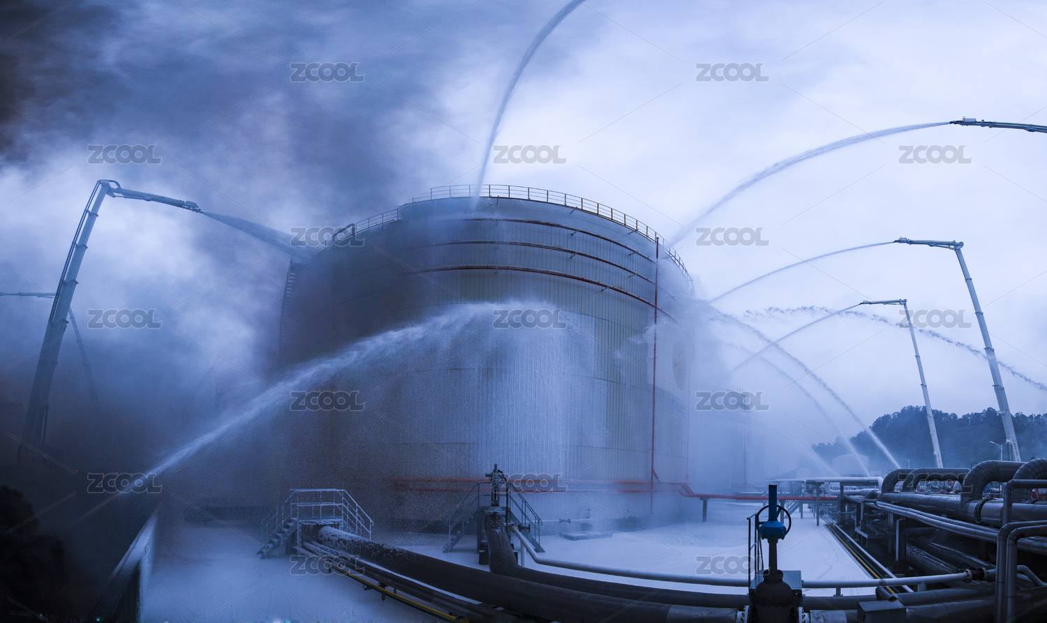 多辆消防高喷车喷射泡沫灭火剂在油罐上