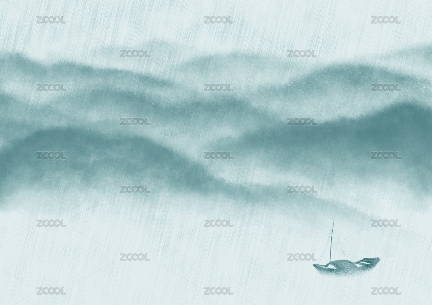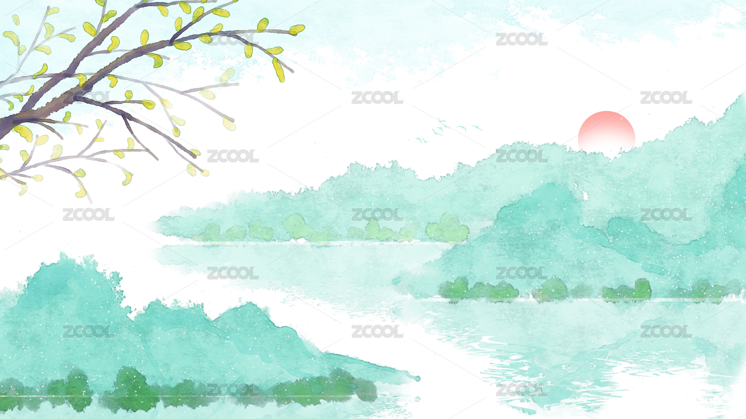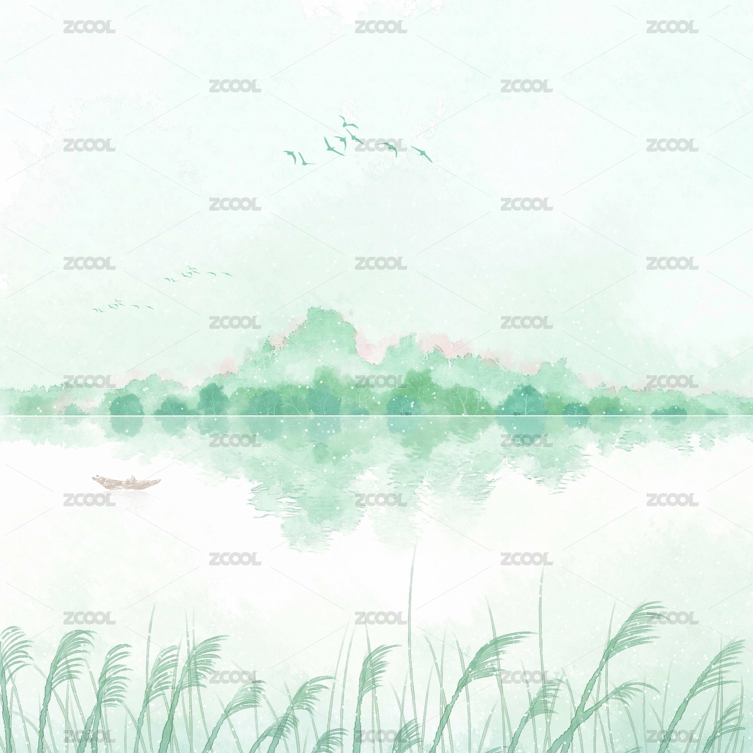 手绘小清新春夏节气水彩场景芦苇远山帆船