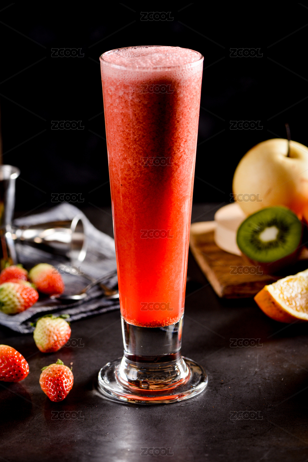 一杯草莓果汁放在黑色底板上