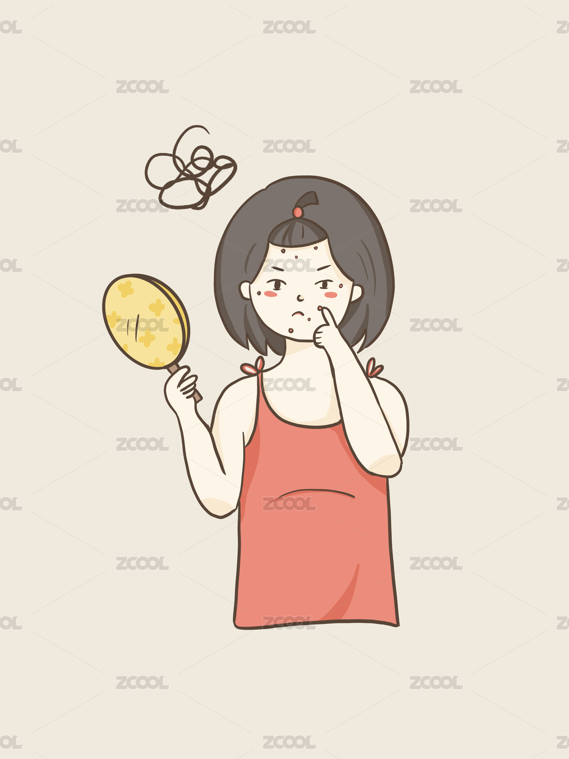 照镜子长痘的女孩插画