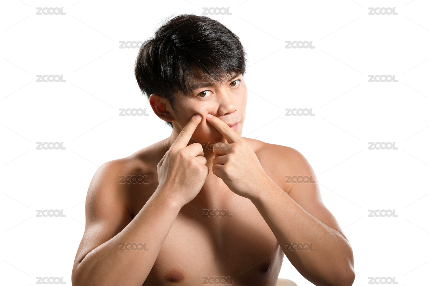 白色背景里的正在挤青春痘的亚洲男士面部特写,化妆护肤整容