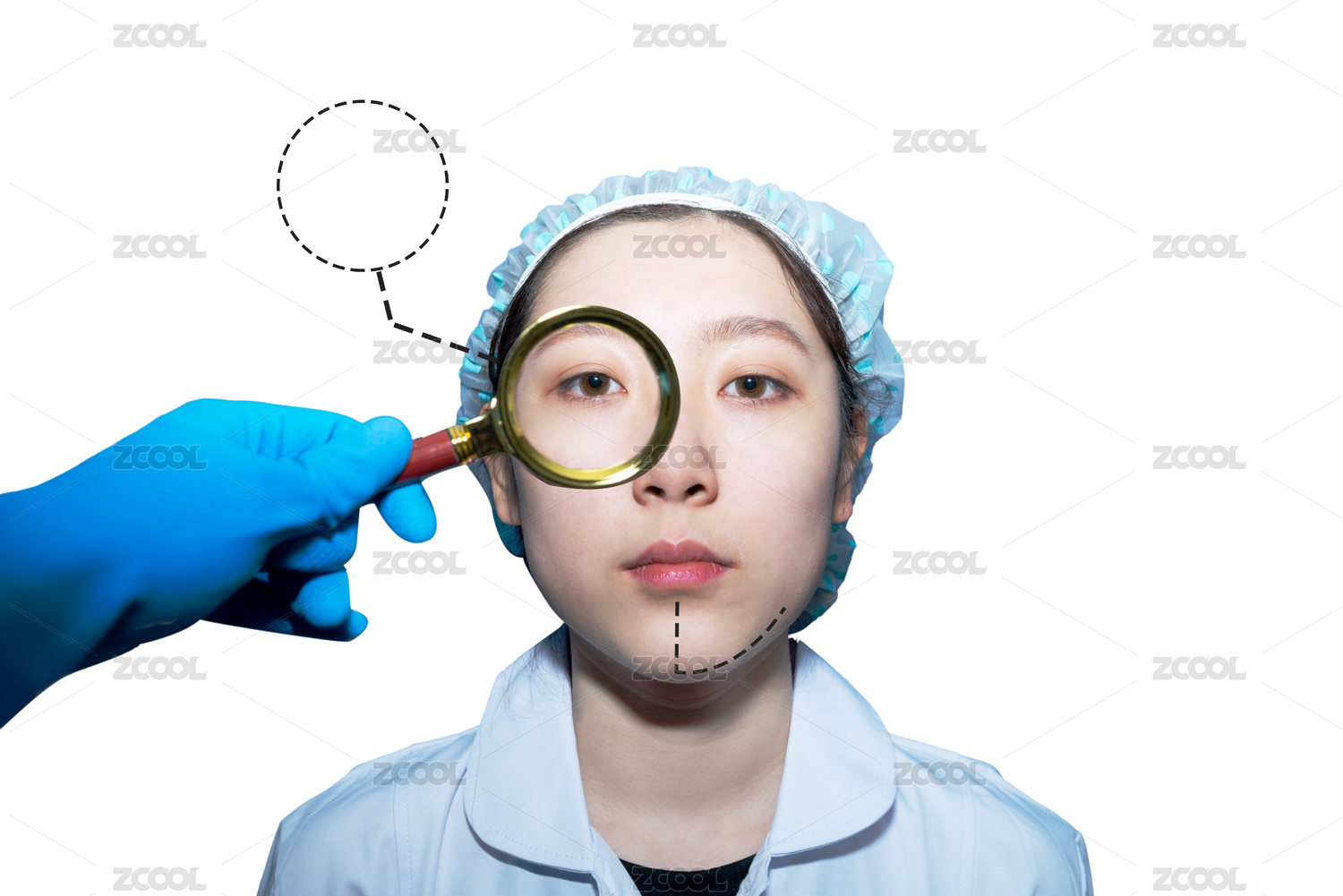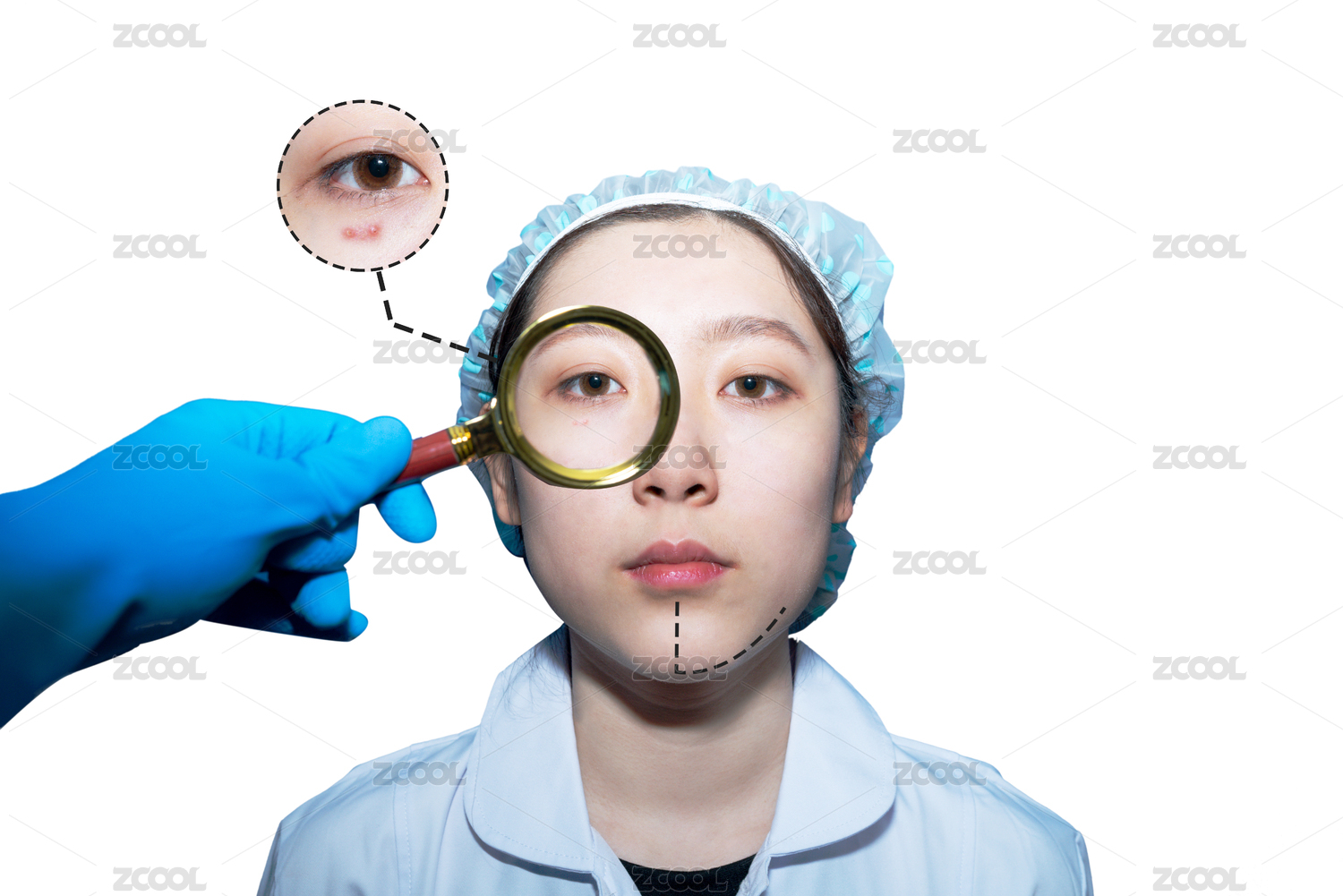 白色背景下医疗护理皮肤放大镜观察一个美女的脸部被螨虫所叮咬起了痘痘皮肤炎症