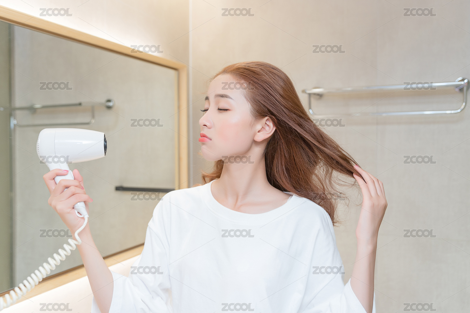 青春美丽女孩在浴室吹自己的头发