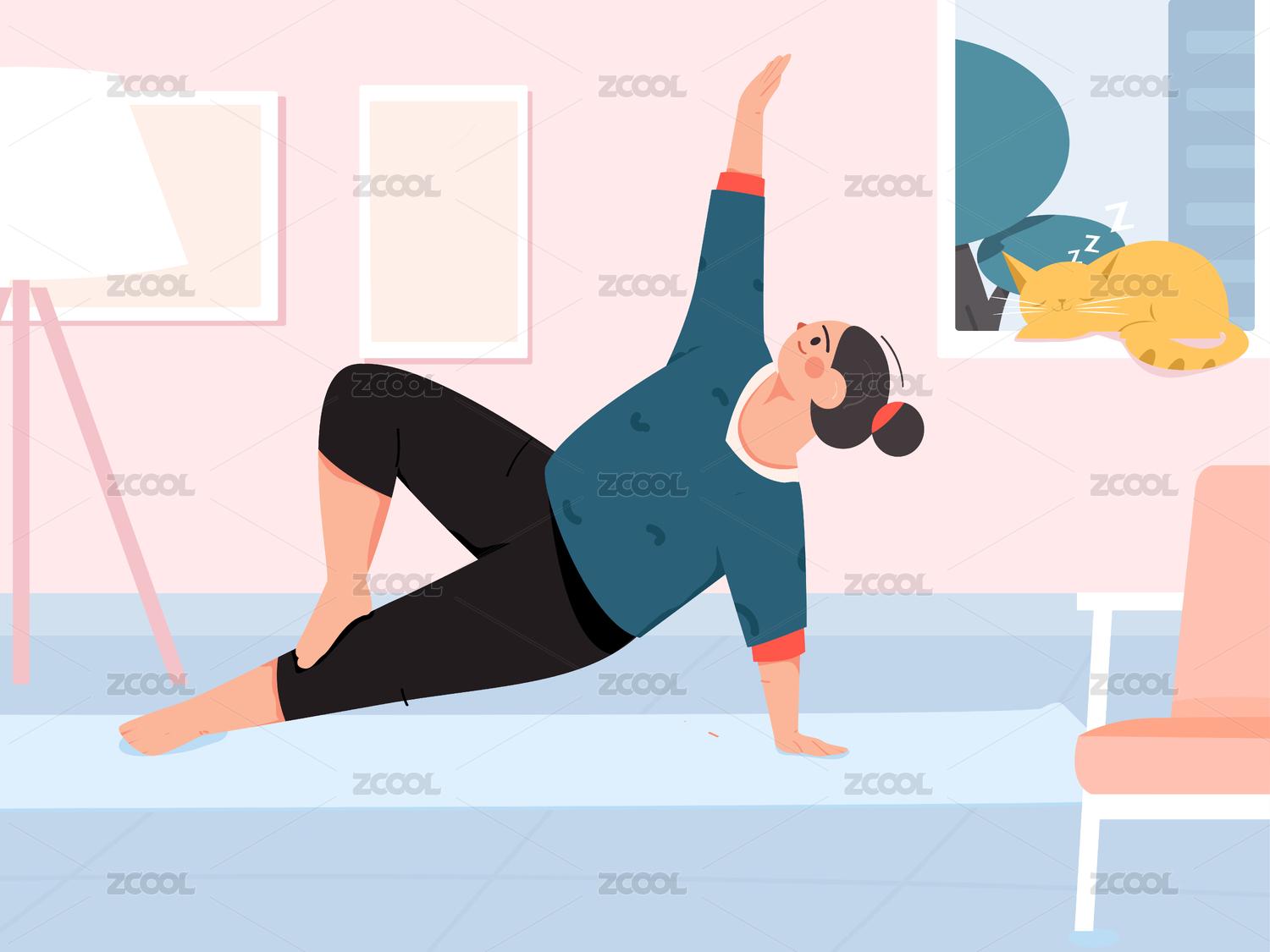 客厅练习瑜伽的女孩