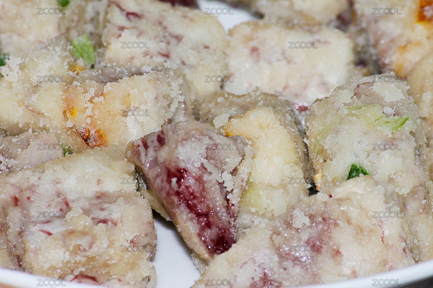 在大理石背景下的油炸番薯丸子与土豆丸子,潮汕小吃