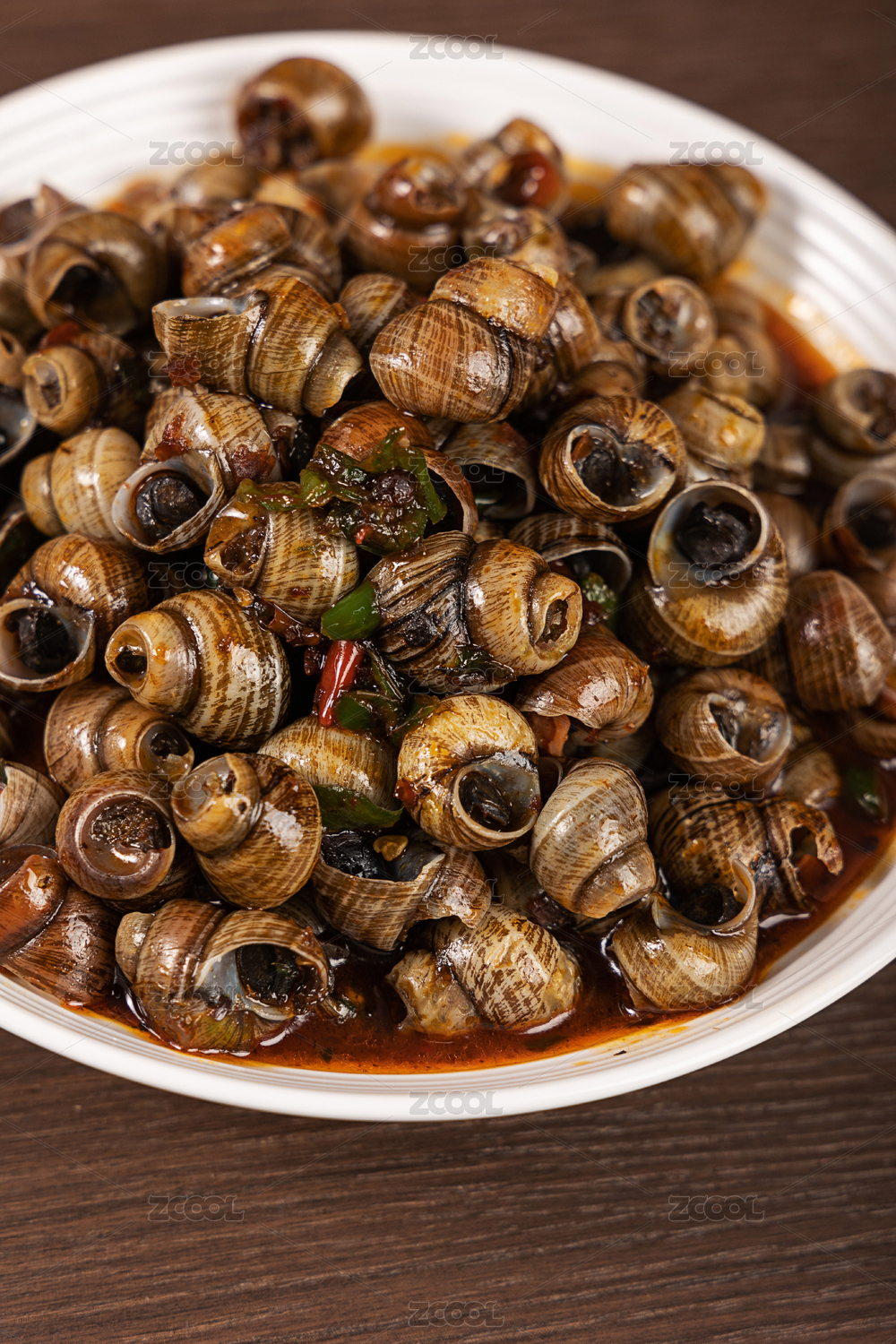 木桌背景中的传统小吃炒田螺
