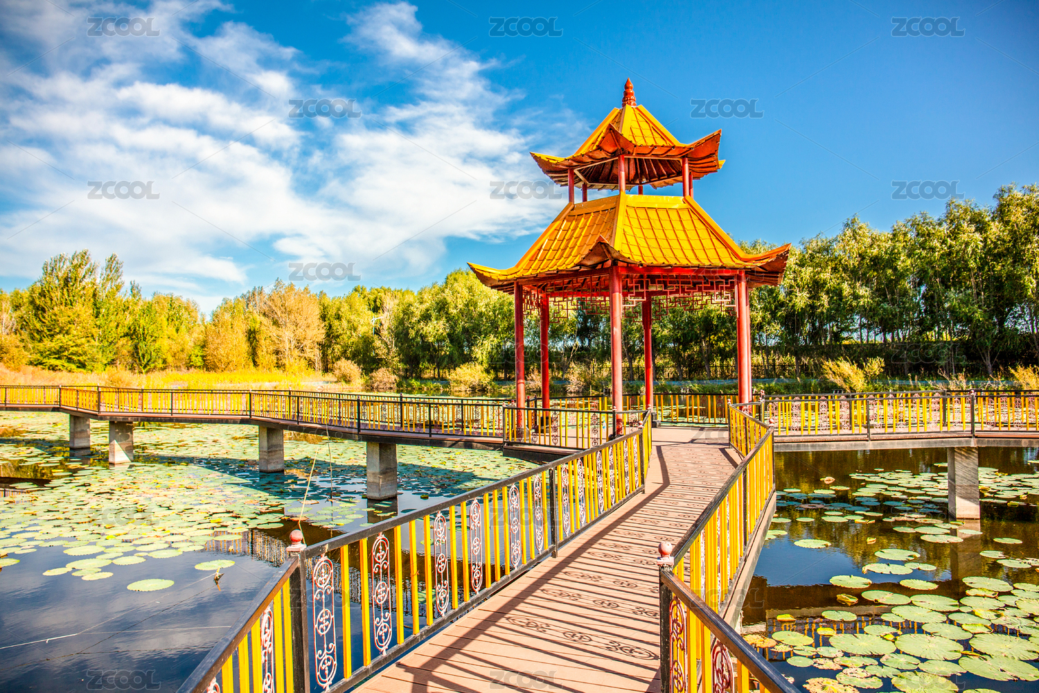 中国吉林省大安嫩江湾旅游荷花池凉亭走廊