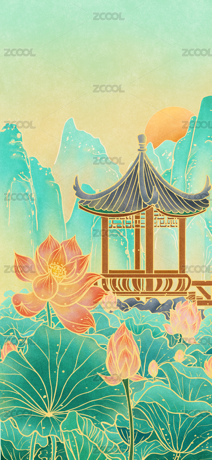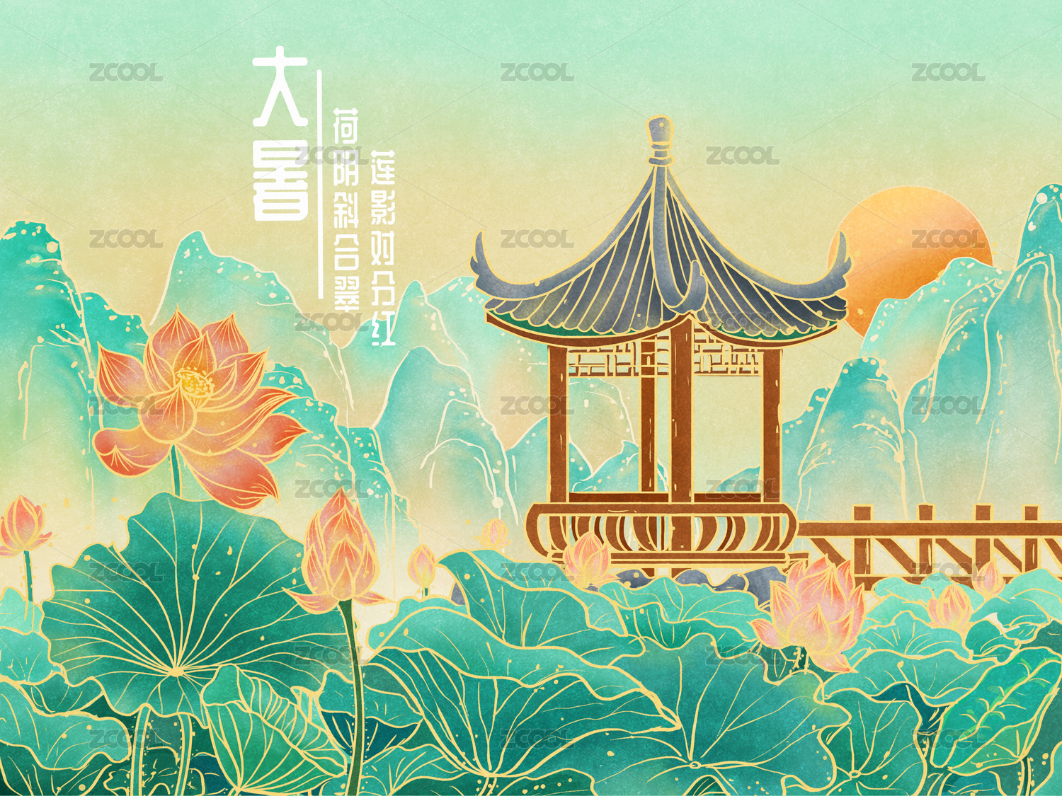 凉亭在荷花池中-中国风大暑处暑节气插画