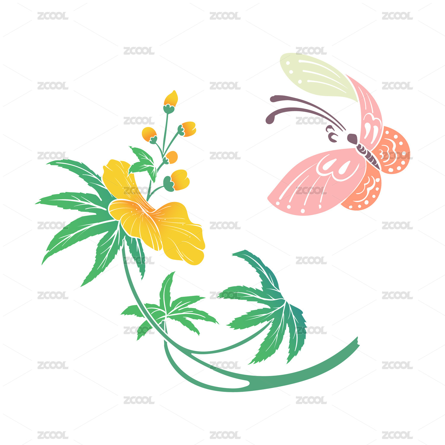 秋葵花 蝴蝶纹组合花卉纹样彩色手绘矢量图