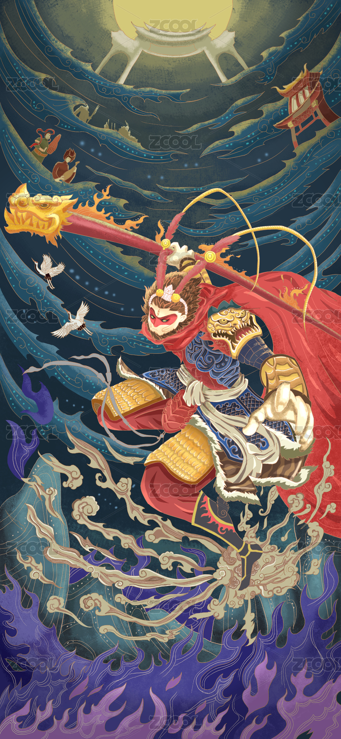 国潮插画孙悟空大闹天宫神话故事插画