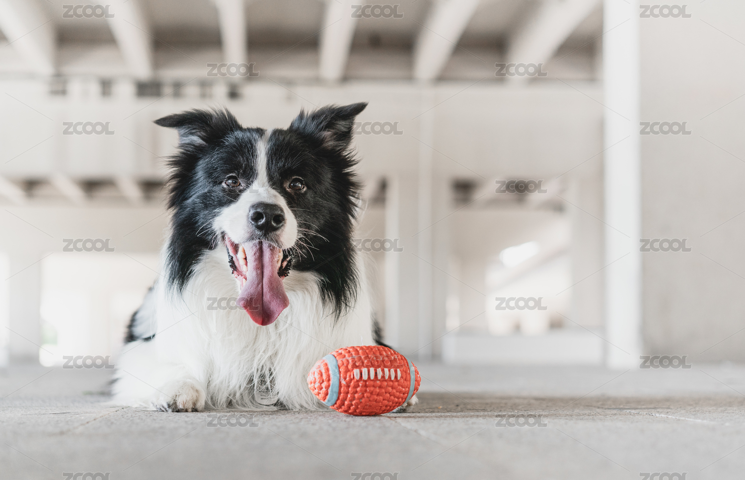 边牧犬带着玩具球趴在水泥地上