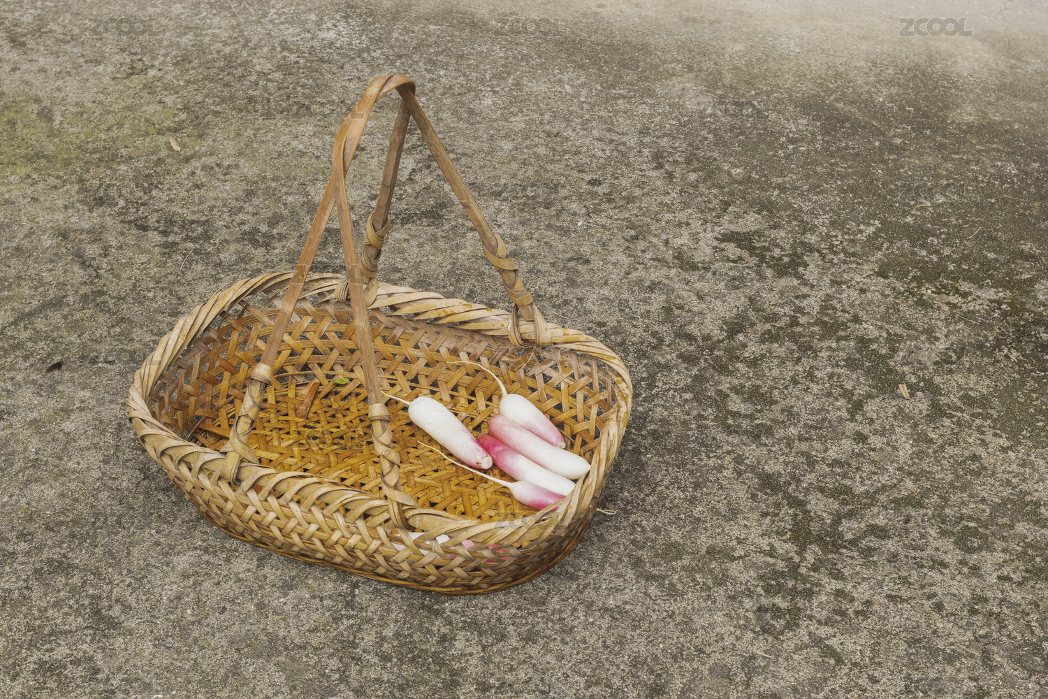 水泥地上装着小萝卜的手工竹编篮子